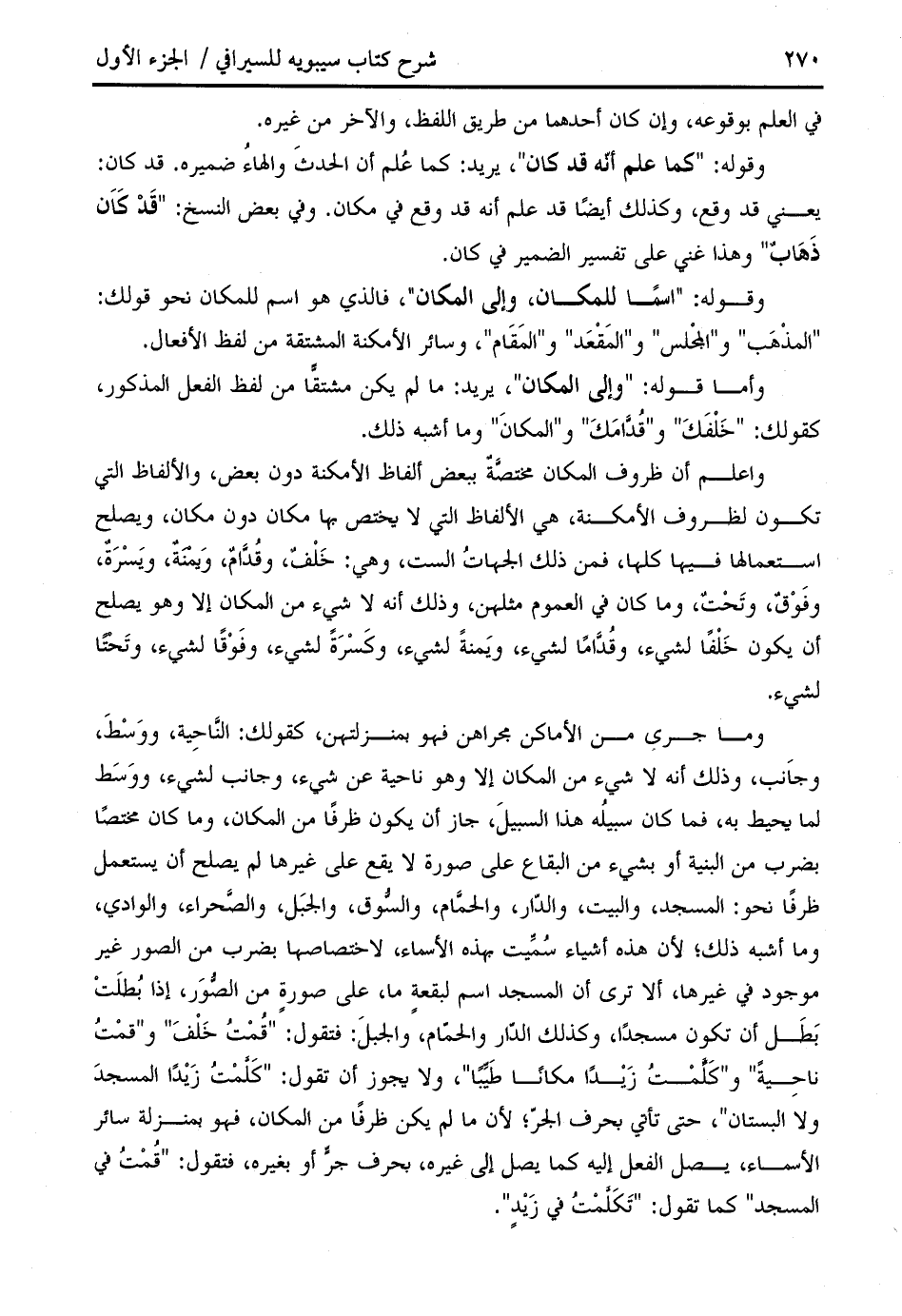 وما جرى من الأماكن مجراهن فهو بمنزلتهن، كقولك: النّاحية، ووسط، وجانب، وذلك أنه لا شيء من المكان إلا وهو ناحية عن شيء، وجانب لشيء، ووسط لما يحيط به، فما كان سبيله هذا السبيل، جاز أن يكون ظرفا من المكان، وما كان مختصا بضرب من البنية أو بشيء من البقاع على صورة لا يقع على غيرها لم يصلح أن يستعمل ظرفا نحو: المسجد، والبيت، والدّار، والحمّام، والسّوق، والجبل، والصّحراء، والوادي، وما أشبه ذلك؛ لأن هذه أشياء سمّيت بهذه الأسماء، لاختصاصها بضرب من الصور غير موجود في غيرها، ألا ترى أن المسجد اسم لبقعة ما، على صورة من الصّور، إذا بطلت بطل أن تكون مسجدا، وكذلك الدّار والحمّام، والجبل: فتقول: " قمت خلف " و " قمت ناحية " و " كلّمت زيدا مكانا طيّبا "، ولا يجوز أن تقول: " كلّمت زيدا المسجد ولا البستان "، حتى تأتي بحرف الجرّ؛ لأن ما لم يكن ظرفا من المكان، فهو بمنزلة سائر الأسماء، يصل الفعل إليه كما يصل إلى غيره، بحرف جرّ أو بغيره، فتقول: " قمت في المسجد " كما تقول: " تكلّمت في زيد ".