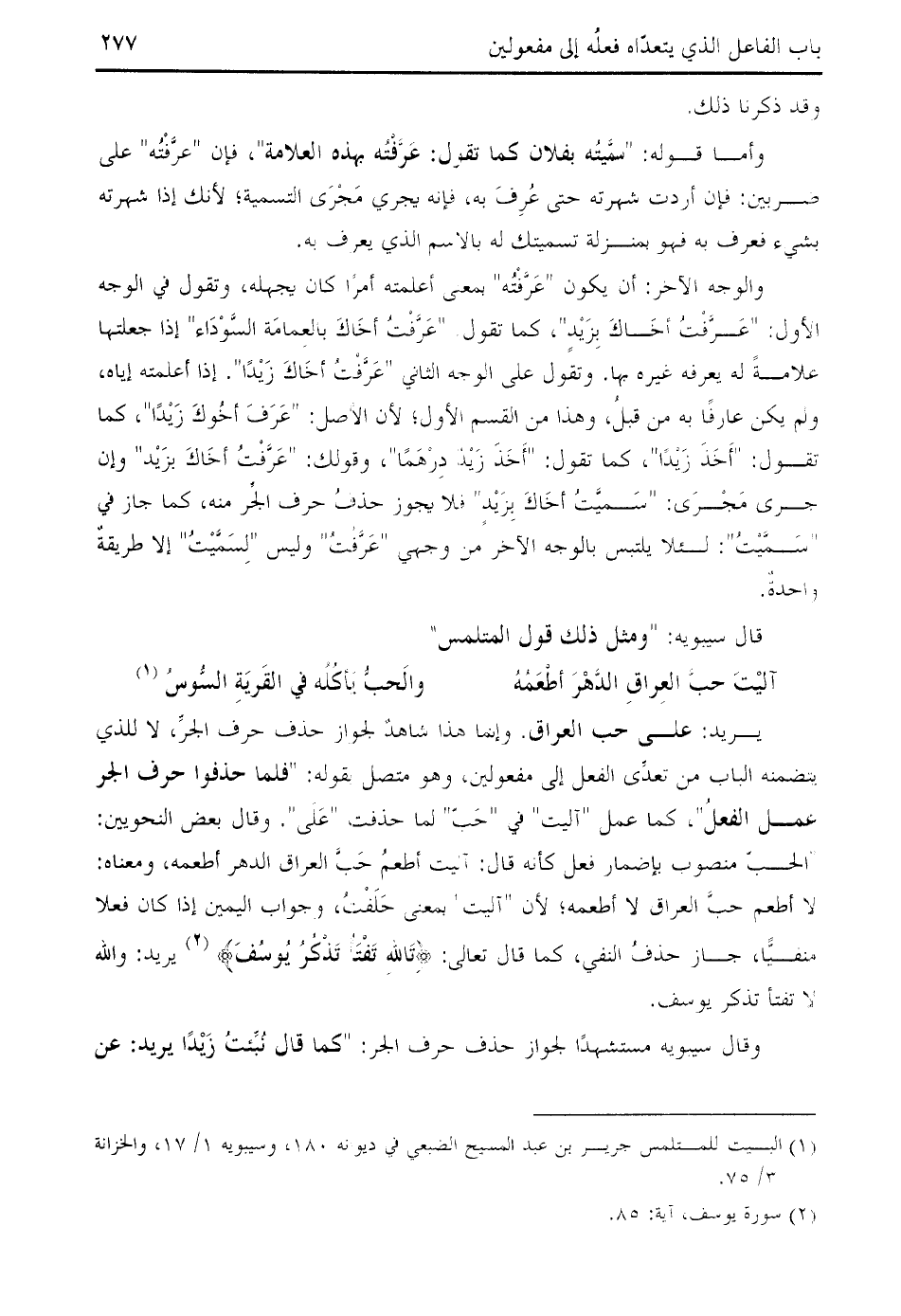 والوجه الآخر: أن يكون " عرّفته " بمعنى أعلمته أمرا كان يجهله، وتقول في الوجه الأول: " عرّفت أخاك بزيد "، كما تقول: " عرّفت أخاك بالعمامة السّوداء " إذا جعلتها علامة له يعرفه غيره بها. وتقول على الوجه الثاني " عرّفت أخاك زيدا ". إذا أعلمته إياه، ولم يكن عارفا به من قبل، وهذا من القسم الأول؛ لأن الأصل: " عرف أخوك زيدا "، كما تقول: " أخذ زيدا "، كما تقول: " أخذ زيد درهما "، وقولك: " عرّفت أخاك بزيد " وإن جرى مجرى: " سمّيت أخاك بزيد " فلا يجوز حذف حرف الجرّ منه، كما جاز في " سمّيت ": لئلا يلتبس بالوجه الآخر من وجهي " عرّفت " وليس " لسمّيت " إلا طريقة واحدة.