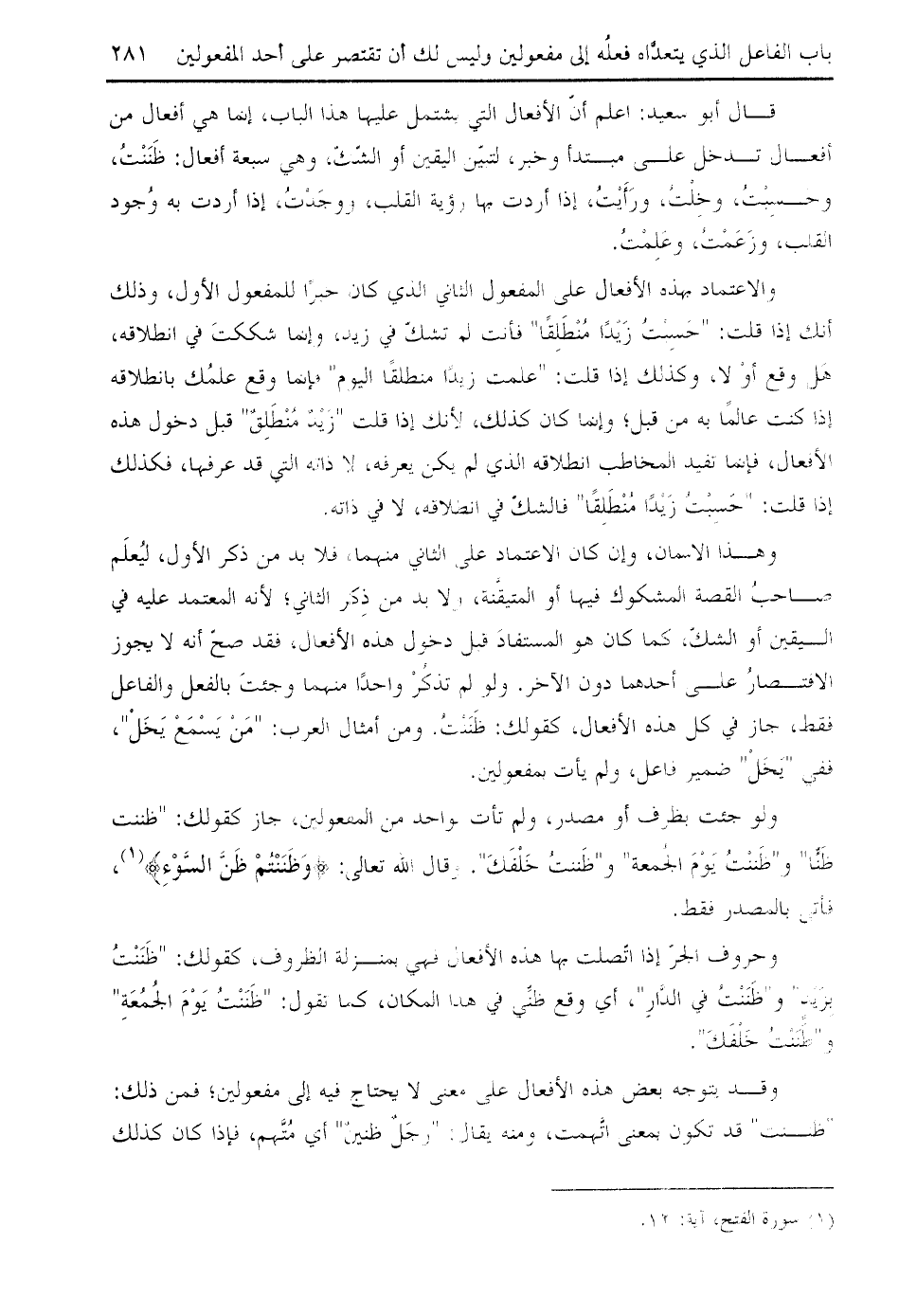 قال أبو سعيد: اعلم أنّ الأفعال التي يشتمل عليها هذا الباب، إنما هي أفعال من أفعال تدخل على مبتدأ وخبر، لتبيّن اليقين أو الشّكّ، وهي سبعة أفعال: ظننت، وحسبت، وخلت، ورأيت، إذا أردت بها رؤية القلب، ووجدت، إذا أردت به وجود القلب، وزعمت، وعلمت.