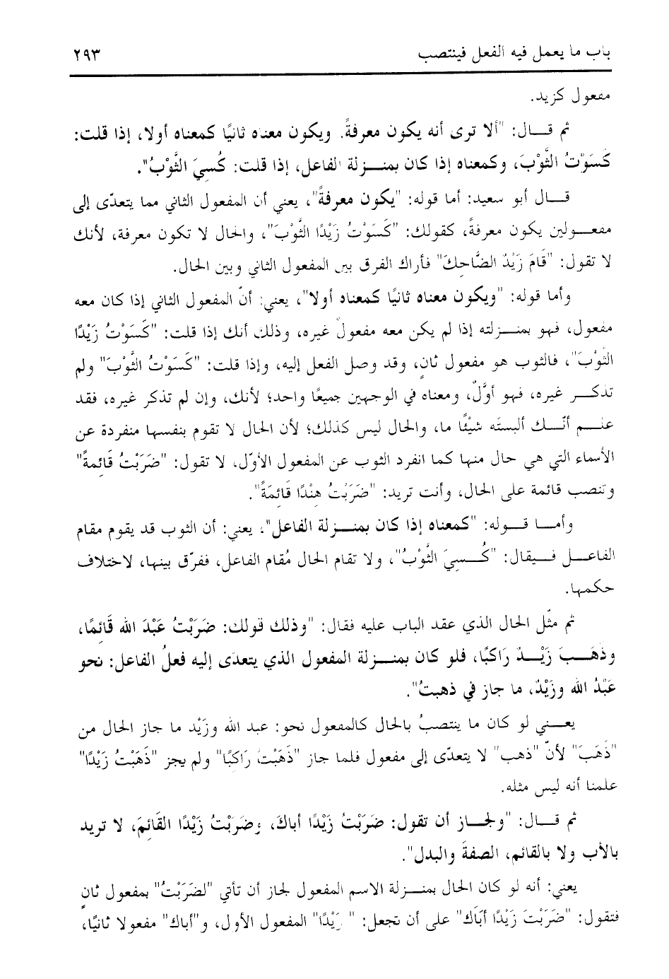وأما قوله: " ويكون معناه ثانيا كمعناه أولا "، يعني: أنّ المفعول الثاني إذا كان معه مفعول، فهو بمنزلته إذا لم يكن معه مفعول غيره، وذلك أنك إذا قلت: " كسوت زيدا الثّوب "، فالثوب هو مفعول ثان، وقد وصل الفعل إليه، وإذا قلت: " كسوت الثّوب " ولم تذكر غيره، فهو أوّل، ومعناه في الوجهين جميعا واحد؛ لأنك، وإن لم تذكر غيره، فقد علم أنّك ألبسته شيئا ما، والحال ليس كذلك؛ لأن الحال لا تقوم بنفسها منفردة عن الأسماء التي هي حال منها كما انفرد الثوب عن المفعول الأوّل، لا تقول: " ضربت قائمة " وتنصب قائمة على الحال، وأنت تريد: " ضربت هندا قائمة ".