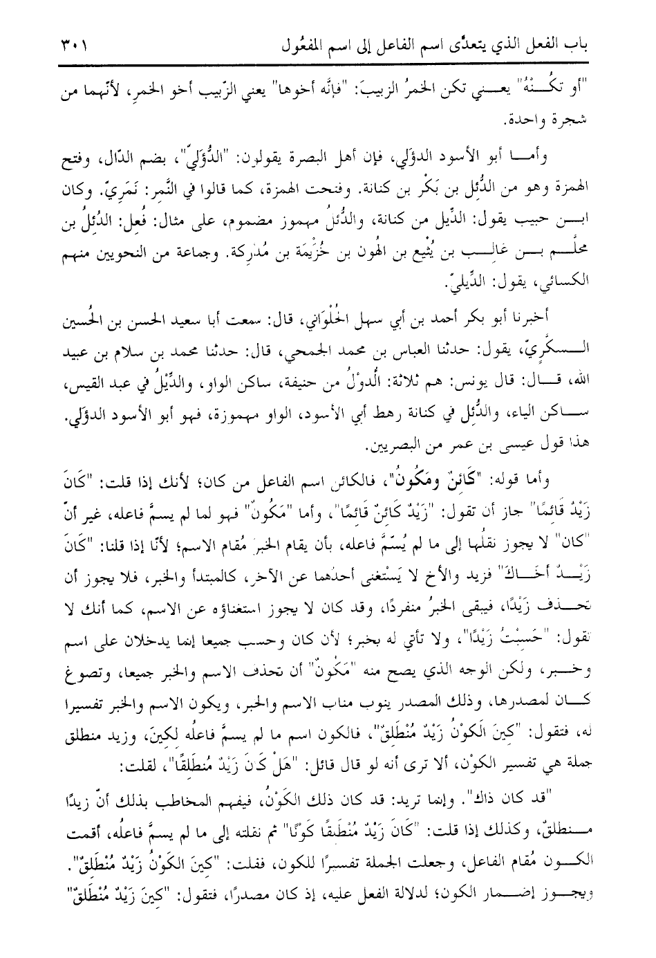 وأما قوله: " كائن ومكون "، فالكائن اسم الفاعل من كان؛ لأنك إذا قلت: " كان زيد قائما " جاز أن تقول: " زيد كائن قائما "، وأما " مكون " فهو لما لم يسمّ فاعله، غير أنّ " كان " لا يجوز نقلها إلى ما لم يسّمّ فاعله، بأن يقام الخبر مقام الاسم؛ لأنّا إذا قلنا: " كان زيد أخاك " فزيد والأخ لا يستغنى أحدهما عن الآخر، كالمبتدأ والخبر، فلا يجوز أن تحذف زيدا، فيبقى الخبر منفردا، وقد كان لا يجوز استغناؤه عن الاسم، كما أنك لا تقول: " حسبت زيدا "، ولا تأتي له بخبر؛ لأن كان وحسب جميعا إنما يدخلان على اسم وخبر، ولكن الوجه الذي يصح منه " مكون " أن تحذف الاسم والخبر جميعا، وتصوغ كان لمصدرها، وذلك المصدر ينوب مناب الاسم والخبر، ويكون الاسم والخبر تفسيرا له، فتقول: " كين الكون زيد منطلق "، فالكون اسم ما لم يسمّ فاعله لكين، وزيد منطلق جملة هي تفسير الكون، ألا ترى أنه لو قال قائل: " هل كان زيد منطلقا "، لقلت: