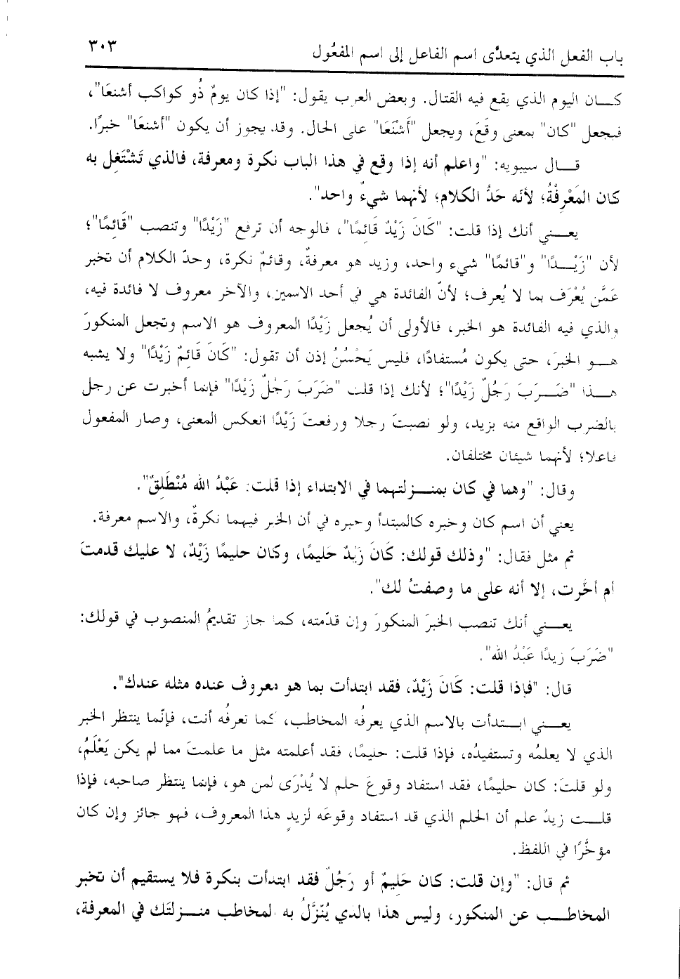 يعني أنك إذا قلت: " كان زيد قائما "، فالوجه أن ترفع " زيدا " وتنصب " قائما "؛ لأن " زيدا " و " قائما " شيء واحد، وزيد هو معرفة، وقائم نكرة، وحدّ الكلام أن تخبر عمّن يعرف بما لا يعرف؛ لأنّ الفائدة هي في أحد الاسمين، والآخر معروف لا فائدة فيه، والذي فيه الفائدة هو الخبر، فالأولى أن يجعل زيدا المعروف هو الاسم وتجعل المنكور هو الخبر، حتى يكون مستفادا، فليس يحسن إذن أن تقول: " كان قائم زيدا " ولا يشبه هذا " ضرب رجل زيدا "؛ لأنك إذا قلت " ضرب رجل زيدا " فإنما أخبرت عن رجل بالضرب الواقع منه بزيد، ولو نصبت رجلا ورفعت زيدا انعكس المعنى، وصار المفعول فاعلا؛ لأنهما شيئان مختلفان.