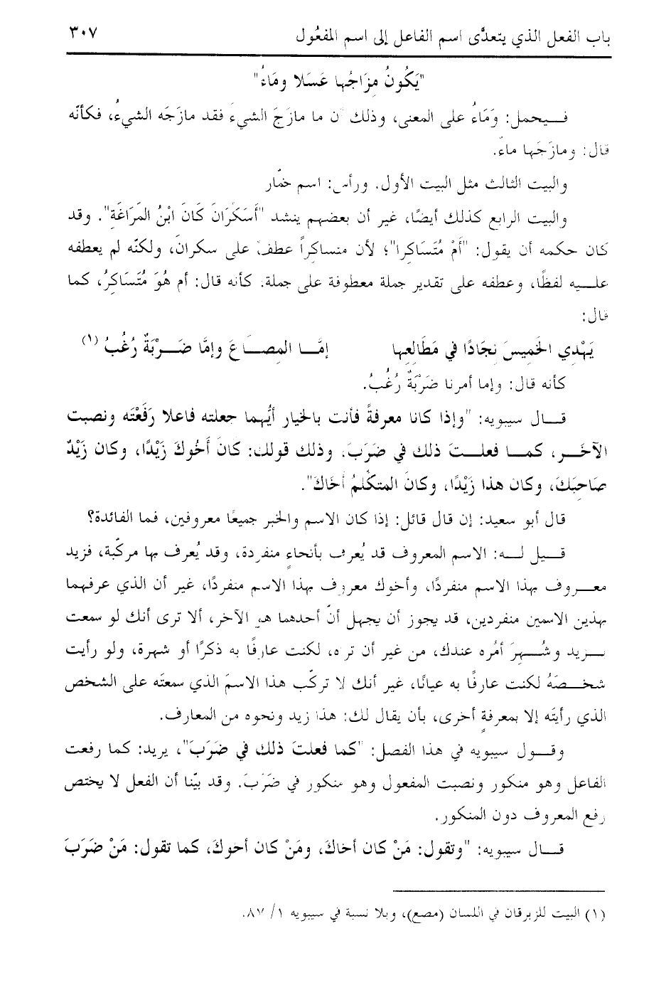 والبيت الرابع كذلك أيضا، غير أن بعضهم ينشد " أسكران كان ابن المراغة ". وقد كان حكمه أن يقول: " أم متساكرا "؛ لأن متساكرا عطف على سكران، ولكنّه لم يعطفه عليه لفظا، وعطفه على تقدير جملة معطوفة على جملة، كأنه قال: أم هو متساكر، كما قال: