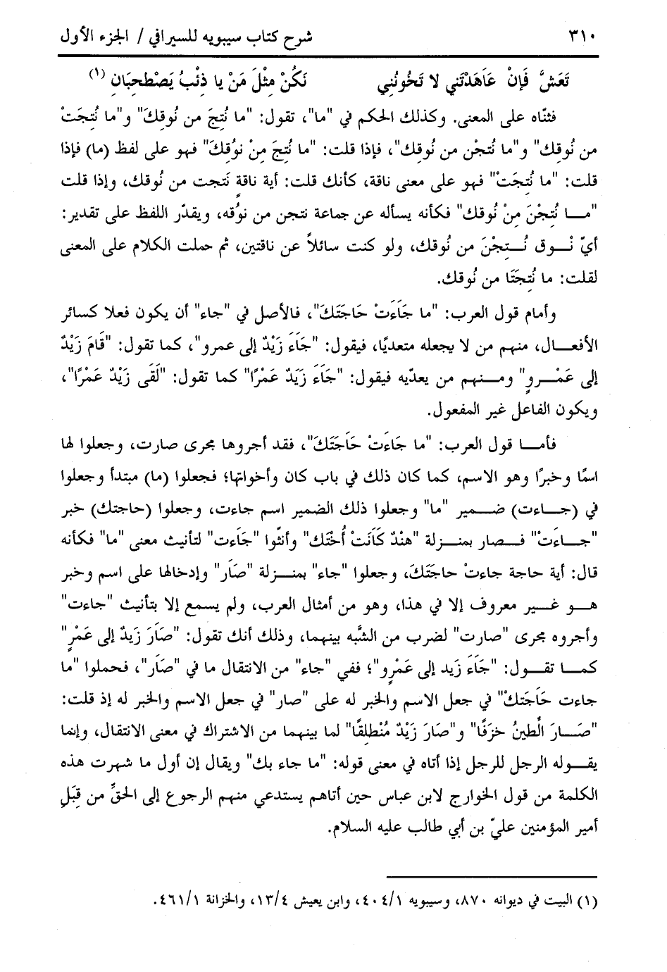 فأما قول العرب: " ما جاءت حاجتك "، فقد أجروها مجرى صارت، وجعلوا لها اسما وخبرا وهو الاسم، كما كان ذلك في باب كان وأخواتها؛ فجعلوا (ما) مبتدأ وجعلوا في (جاءت) ضمير " ما " وجعلوا ذلك الضمير اسم جاءت، وجعلوا (حاجتك) خبر " جاءت " فصار بمنزلة " هند كانت أختك " وأنثّوا " جاءت " لتأنيث معنى " ما " فكأنه قال: أية حاجة جاءت حاجتك، وجعلوا " جاء " بمنزلة " صار " وإدخالها على اسم وخبر هو غير معروف إلا في هذا، وهو من أمثال العرب، ولم يسمع إلا بتأنيث " جاءت " وأجروه مجرى " صارت " لضرب من الشّبه بينهما، وذلك أنك تقول: " صار زيد إلى عمر " كما تقول: " جاء زيد إلى عمرو "؛ ففي " جاء " من الانتقال ما في " صار "، فحملوا " ما