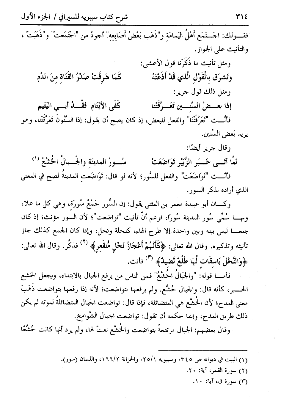 وكان أبو عبيدة معمر بن المثنى يقول: إن السّور جمع سورة، وهي كل ما علا، وبها سمّي سور المدينة سورا، فزعم أنّ تأنيث " تواضعت "؛ لأن السور مؤنث؛ إذ كان جمعا ليس بينه وبين واحدة إلا طرح الهاء، كنحلة ونحل، وإذا كان الجمع كذلك جاز تأنيثه وتذكيره. وقال الله تعالى: كَأَنَّهُمْ أَعْجازُ نَخْلٍ مُنْقَعِرٍ (¬2) فذكّر. وقال الله تعالى: