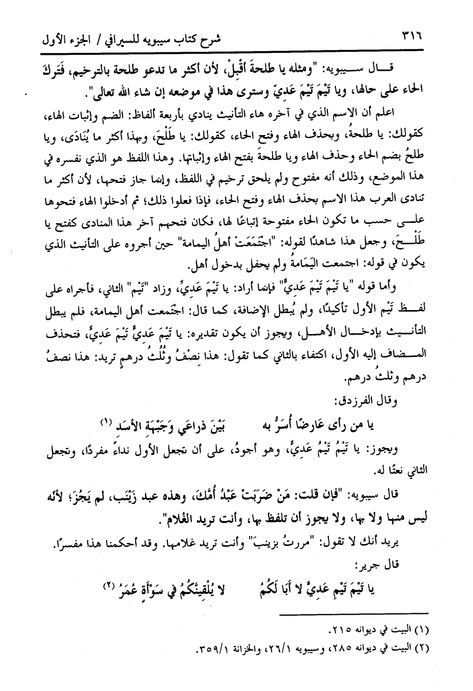 قال سيبويه: " ومثله يا طلحة أقبل، لأن أكثر ما تدعو طلحة بالترخيم، فترك الحاء على حالها، ويا تيم تيم عديّ وسترى هذا في موضعه إن شاء الله تعالى ".