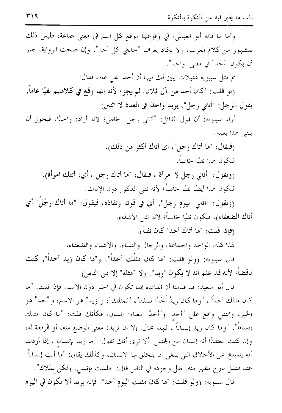 ثم مثل سيبويه تمثيلات يبين لك فيها أن أحدا نفي عام، فقال:
