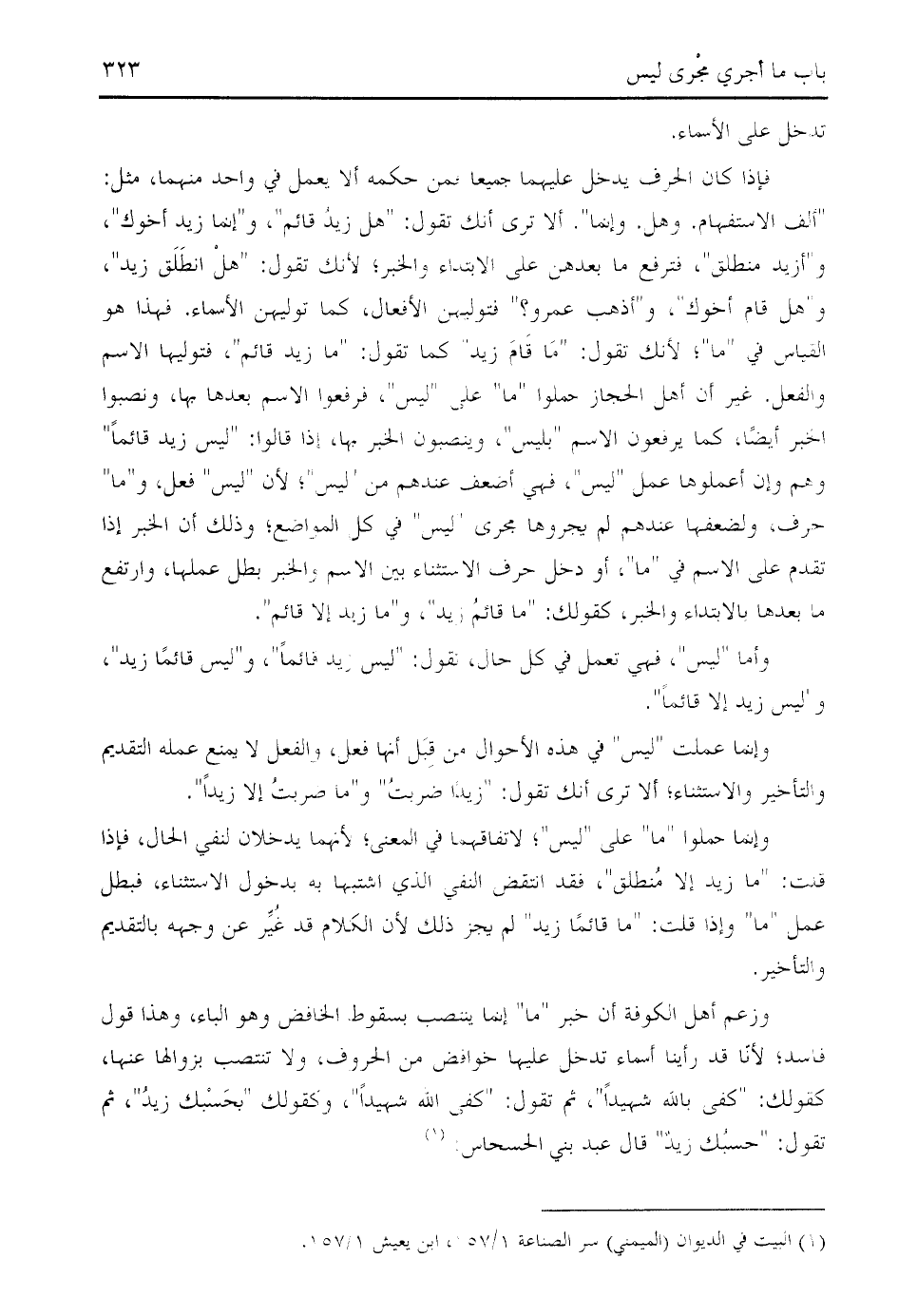 وزعم أهل الكوفة أن خبر " ما " إنما ينتصب بسقوط الخافض وهو الباء، وهذا قول فاسد؛ لأنّا قد رأينا أسماء تدخل عليها خوافض من الحروف، ولا تنتصب بزوالها عنها، كقولك: " كفى بالله شهيدا "، ثم تقول: " كفى الله شهيدا "، وكقولك " بحسبك زيد "، ثم تقول: " حسبك زيد " قال عبد بني الحسحاس: (¬1)