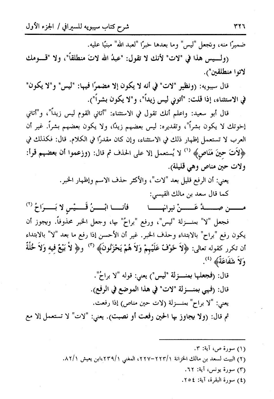 قال سيبويه: (ونظير " لات " في أنه لا يكون إلا مضمرا فيها: " ليس " و " لا يكون " في الاستثناء، إذا قلت: " أتوني ليس زيدا "، و " لا يكون بشرا ").