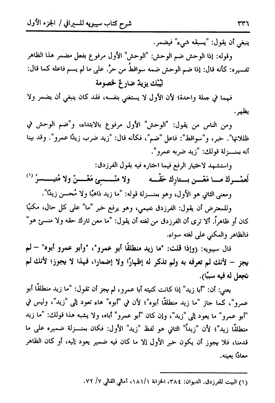 وللمعترض أن يقول: الفرزدق تميمي، وهو يرفع خبر " ما " على كل حال، مكنيّا كان أو ظاهرا. ألا ترى أن الفرزدق من لغته أن يقول: " ما معن تارك حقه ولا منسئ هو " فالظاهر والمكني على لغته سواء.