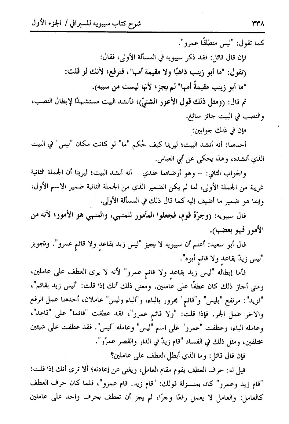 قال أبو سعيد: أعلم أن سيبويه لا يجيز " ليس زيد بقاعد ولا قائم عمرو ". وتجويز " ليس زيد بقاعد ولا قائم أبوه ".