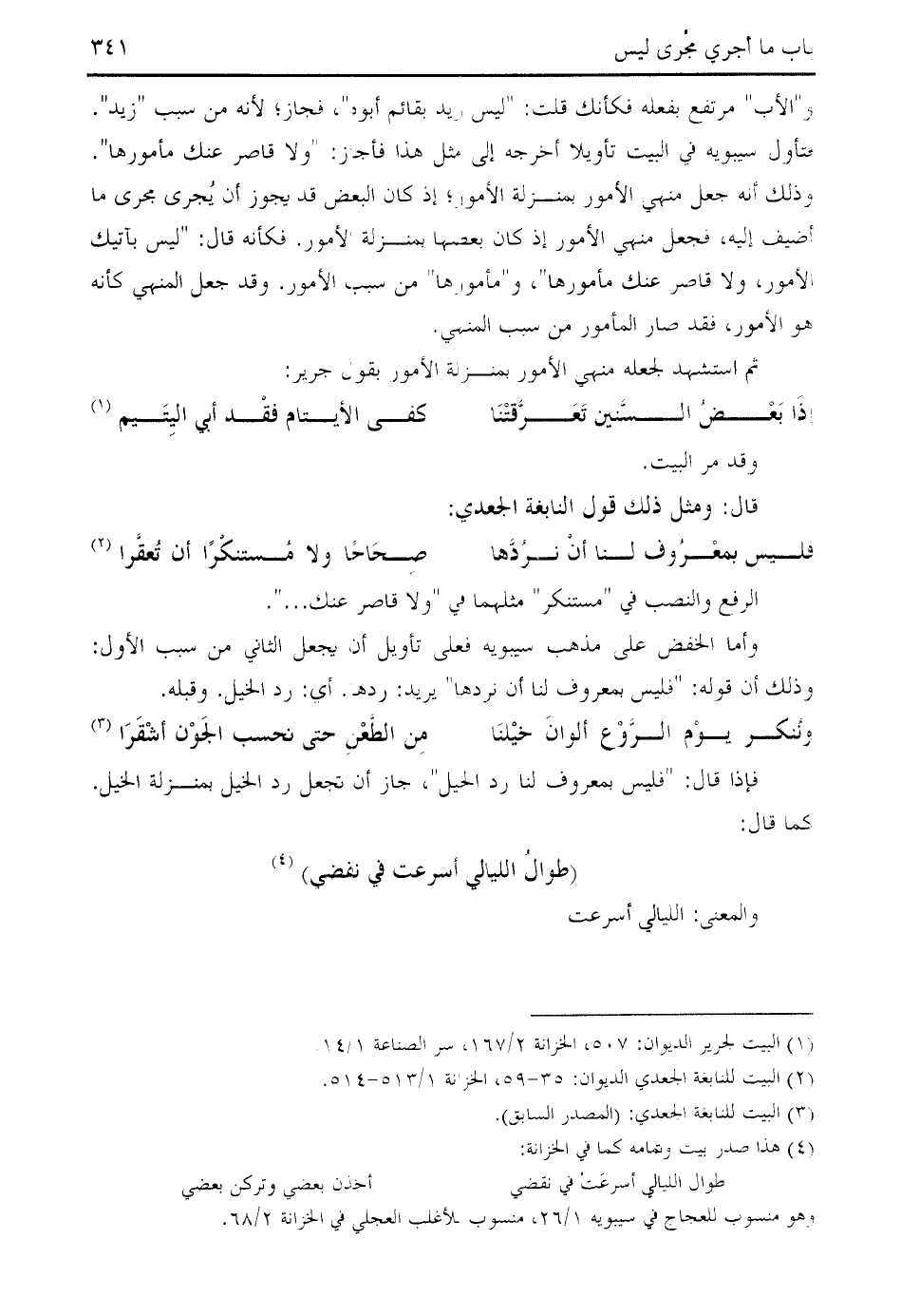 فتأول سيبويه في البيت تأويلا أخرجه إلى مثل هذا فأجاز: " ولا قاصر عنك مأمورها ".