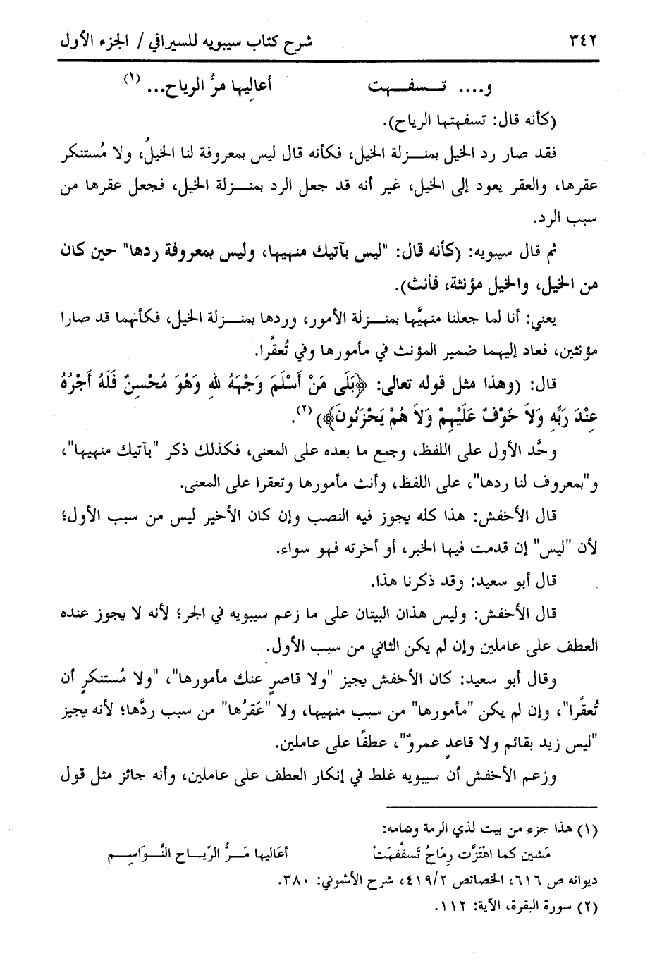 ثم قال سيبويه: (كأنه قال: " ليس بآتيك منهيها، وليس بمعروفة ردها " حين كان من الخيل، والخيل مؤنثة، فأنث).