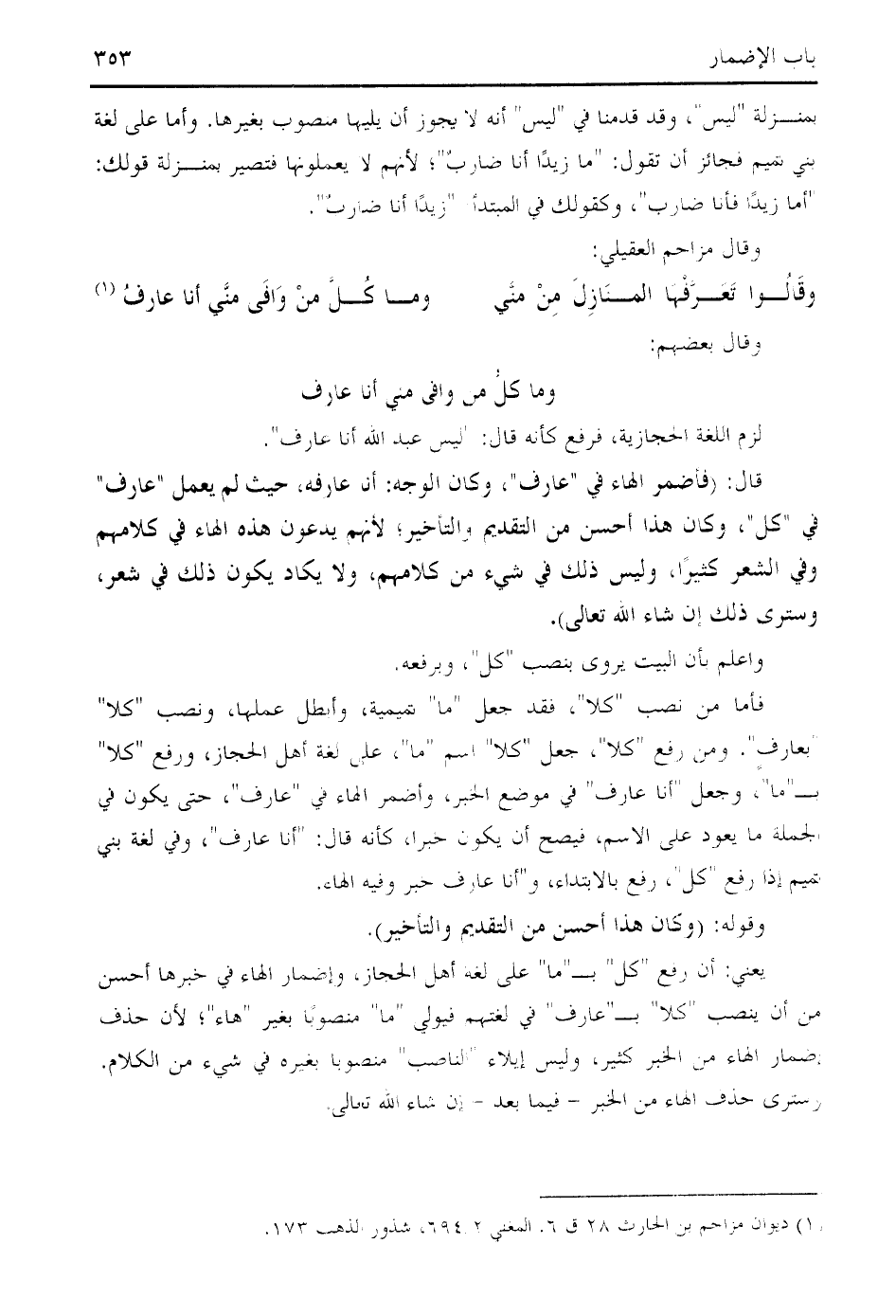 قال: (فأضمر الهاء في " عارف "، وكان الوجه: أنا عارفه، حيث لم يعمل " عارف " في " كل "، وكان هذا أحسن من التقديم والتأخير؛ لأنهم يدعون هذه الهاء في كلامهم وفي الشعر كثيرا، وليس ذلك في شيء من كلامهم، ولا يكاد يكون ذلك في شعر، وسترى ذلك إن شاء الله تعالى).