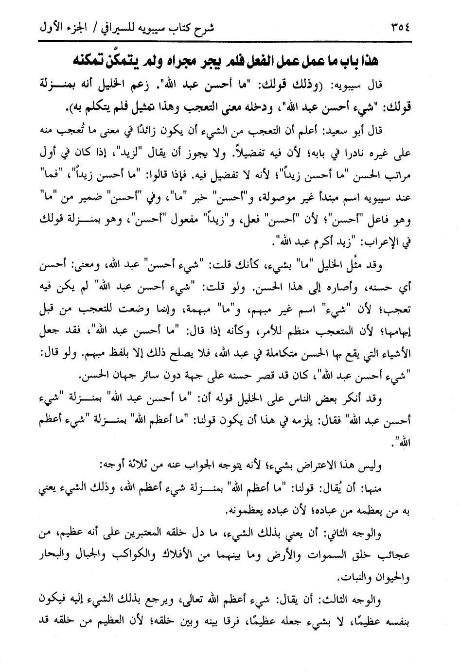 وقد أنكر بعض الناس على الخليل قوله أن: " ما أحسن عبد الله " بمنزلة " شيء أحسن عبد الله " فقال: يلزمه في هذا أن يكون قولنا: " ما أعظم الله " بمنزلة " شيء أعظم الله ".
