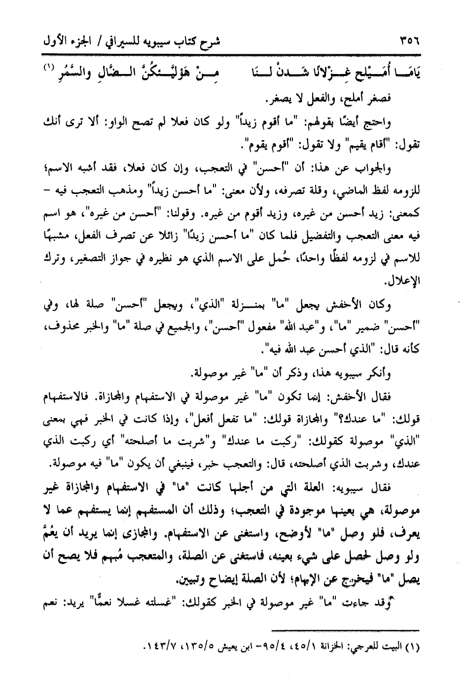 فقال الأخفش: إنما تكون " ما " غير موصولة في الاستفهام والمجازاة. فالاستفهام قولك: " ما عندك؟ " والمجازاة قولك: " ما تفعل أفعل "، وإذا كانت في الخبر فهي بمعنى " الذي " موصولة كقولك: " ركبت ما عندك " و " شربت ما أصلحته " أي ركبت الذي عندك، وشربت الذي أصلحته، قال: والتعجب خبر، فينبغي أن يكون " ما " فيه موصولة.