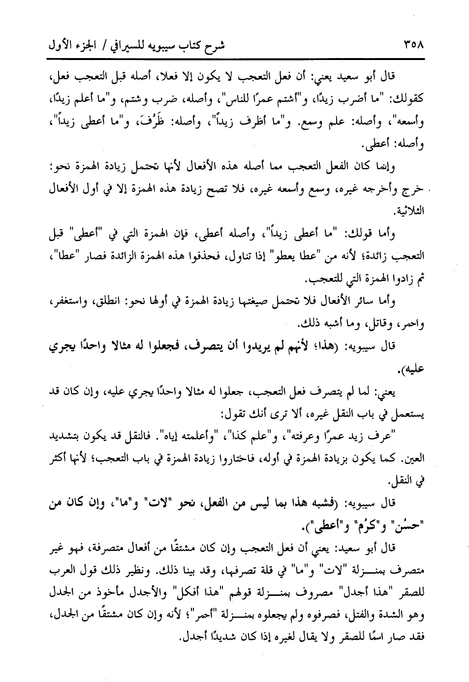 قال أبو سعيد يعني: أن فعل التعجب لا يكون إلا فعلا، أصله قبل التعجب فعل، كقولك: " ما أضرب زيدا، و " أشتم عمرا للناس "، وأصله، ضرب وشتم، و " ما أعلم زيدا، وأسمعه "، وأصله: علم وسمع. و " ما أظرف زيدا "، وأصله: ظرف، و " ما أعطى زيدا "، وأصله: أعطى.