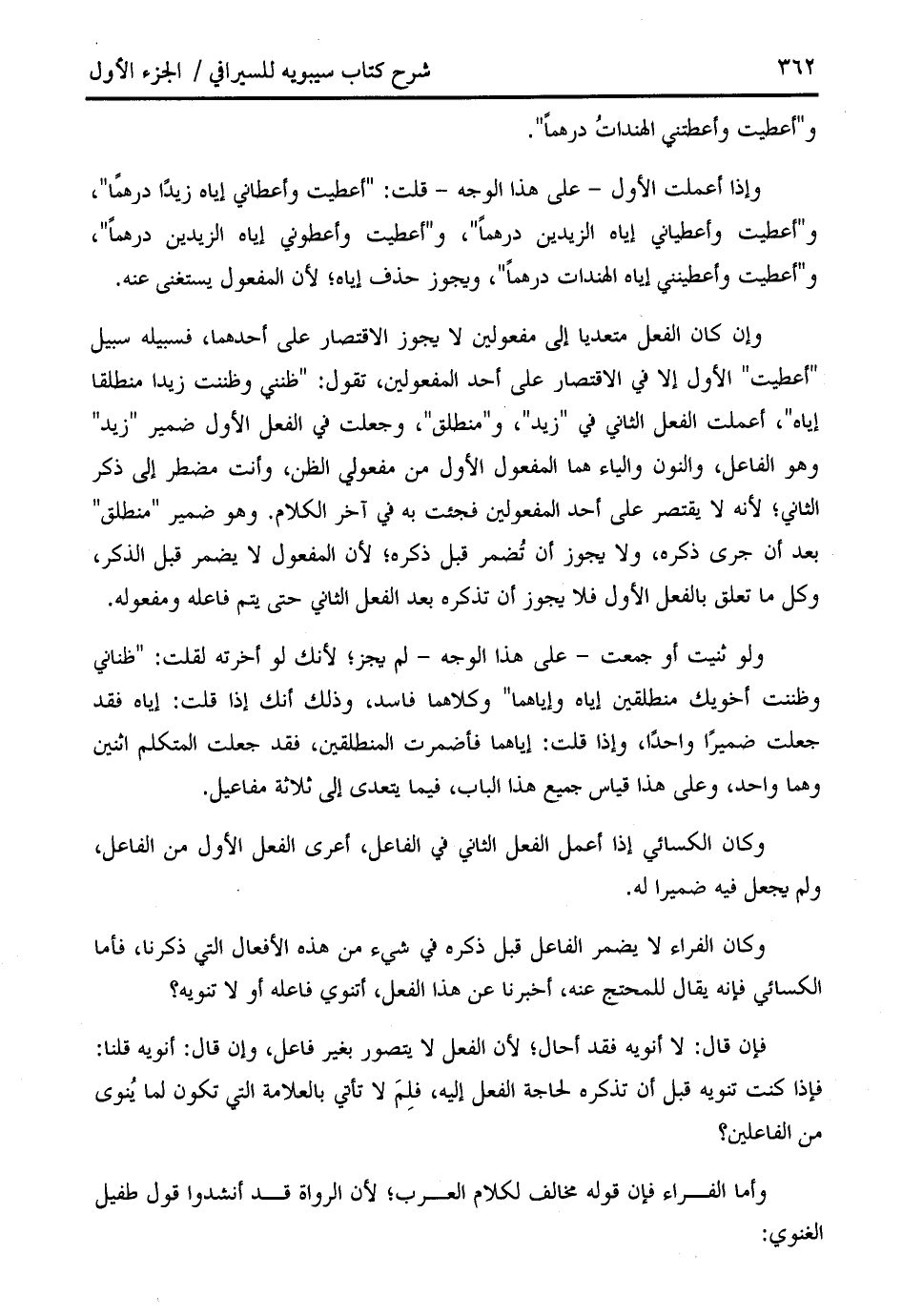 وإذا أعملت الأول- على هذا الوجه- قلت: " أعطيت وأعطاني إياه زيدا درهما "، و " أعطيت وأعطياني إياه الزيدين درهما "، و " أعطيت وأعطوني إياه الزيدين درهما "، و " أعطيت وأعطينني إياه الهندات درهما "، ويجوز حذف إياه؛ لأن المفعول يستغنى عنه.