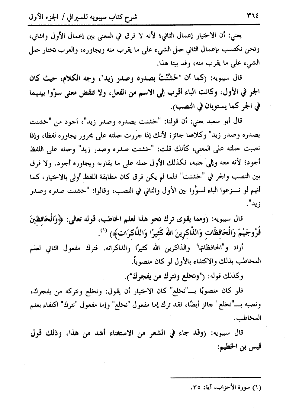 قال سيبويه: (ومما يقوى ترك نحو هذا لعلم الخاطب، قوله تعالى: وَالْحافِظِينَ فُرُوجَهُمْ وَالْحافِظاتِ وَالذَّاكِرِينَ اللَّهَ كَثِيراً وَالذَّاكِراتِ) (¬1).