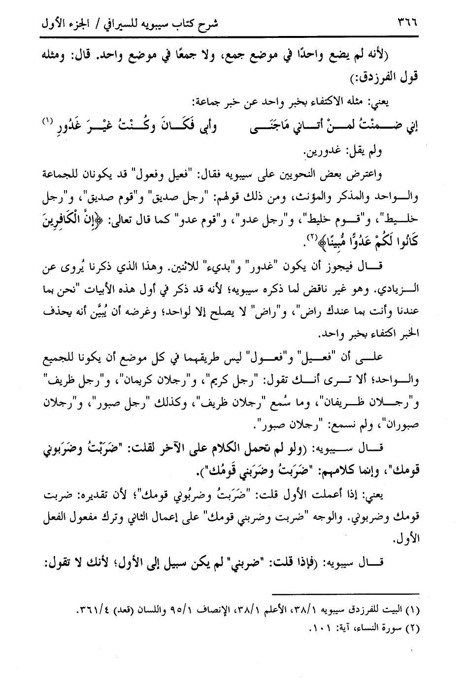 واعترض بعض النحويين على سيبويه فقال: " فعيل وفعول " قد يكونان للجماعة والواحد والمذكر والمؤنث، ومن ذلك قولهم: " رجل صديق " و " قوم صديق "، و " رجل خليط "، و " قوم خليط "، و " رجل عدو "، و " قوم عدو " كما قال تعالى: إِنَّ الْكافِرِينَ كانُوا لَكُمْ عَدُوًّا مُبِيناً (¬2).