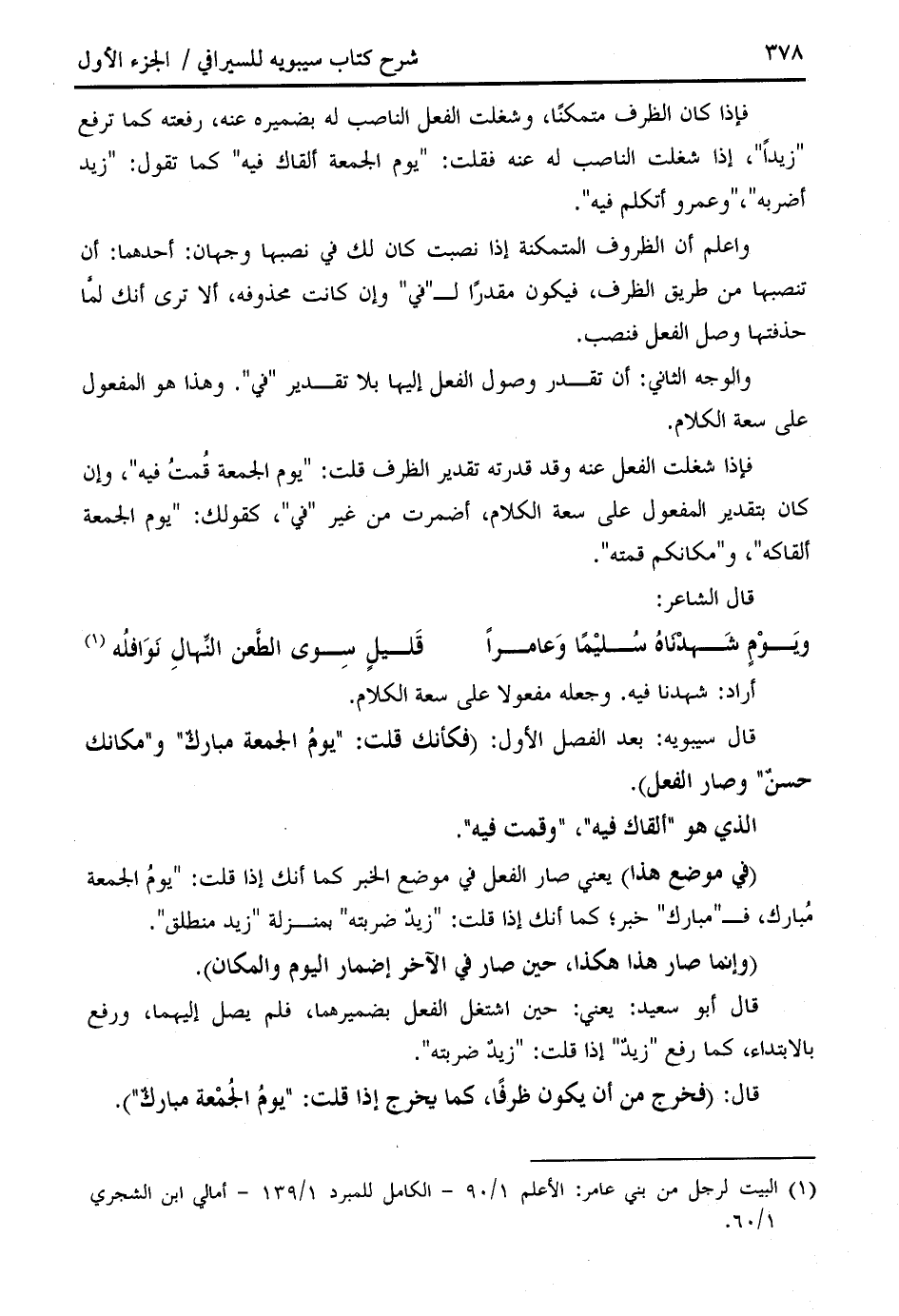 فإذا شغلت الفعل عنه وقد قدرته تقدير الظرف قلت: " يوم الجمعة قمت فيه "، وإن كان بتقدير المفعول على سعة الكلام، أضمرت من غير " في "، كقولك: " يوم الجمعة ألقاكه "، و " مكانكم قمته ".