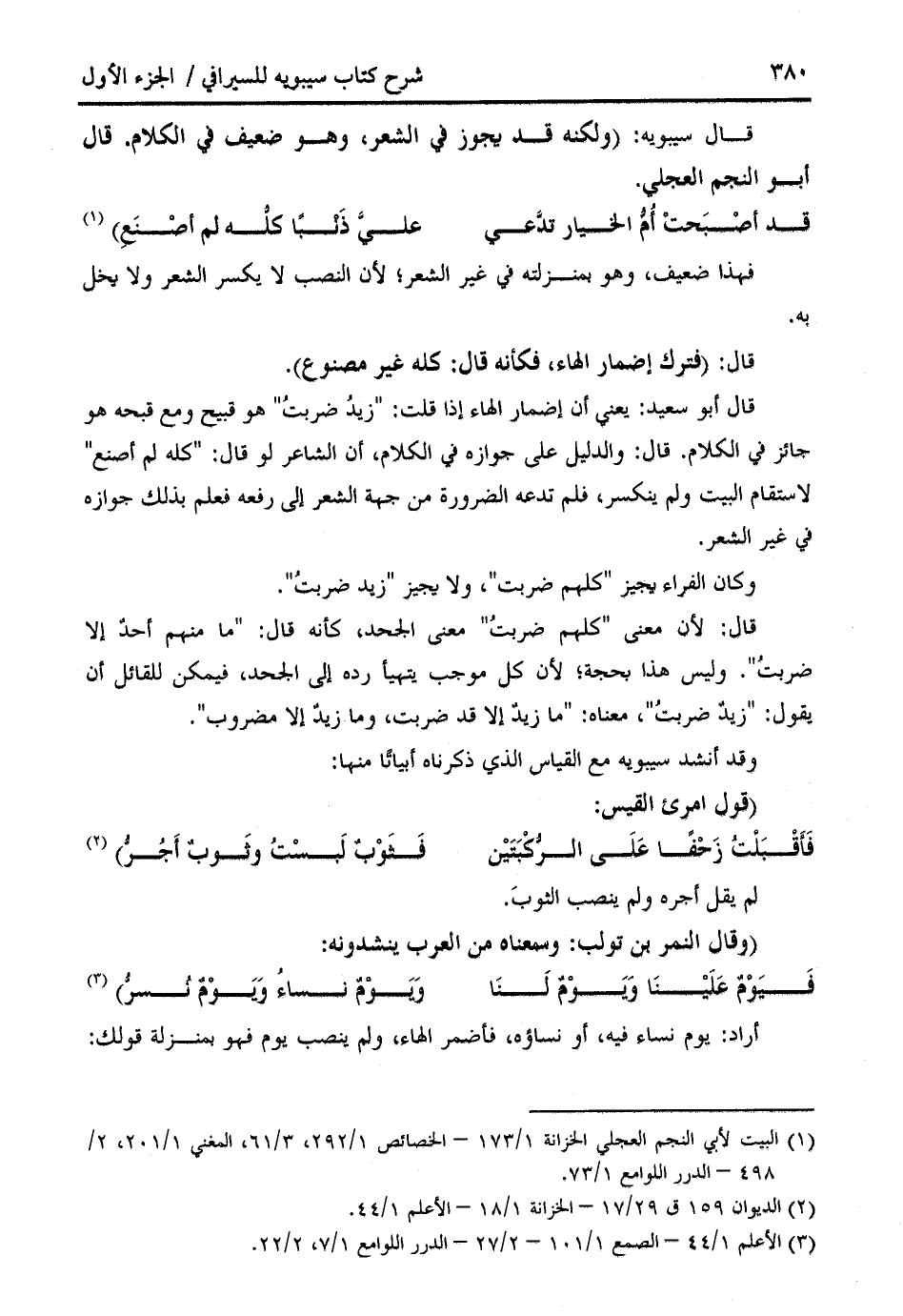 قال سيبويه: (ولكنه قد يجوز في الشعر، وهو ضعيف في الكلام. قال أبو النجم العجلي.