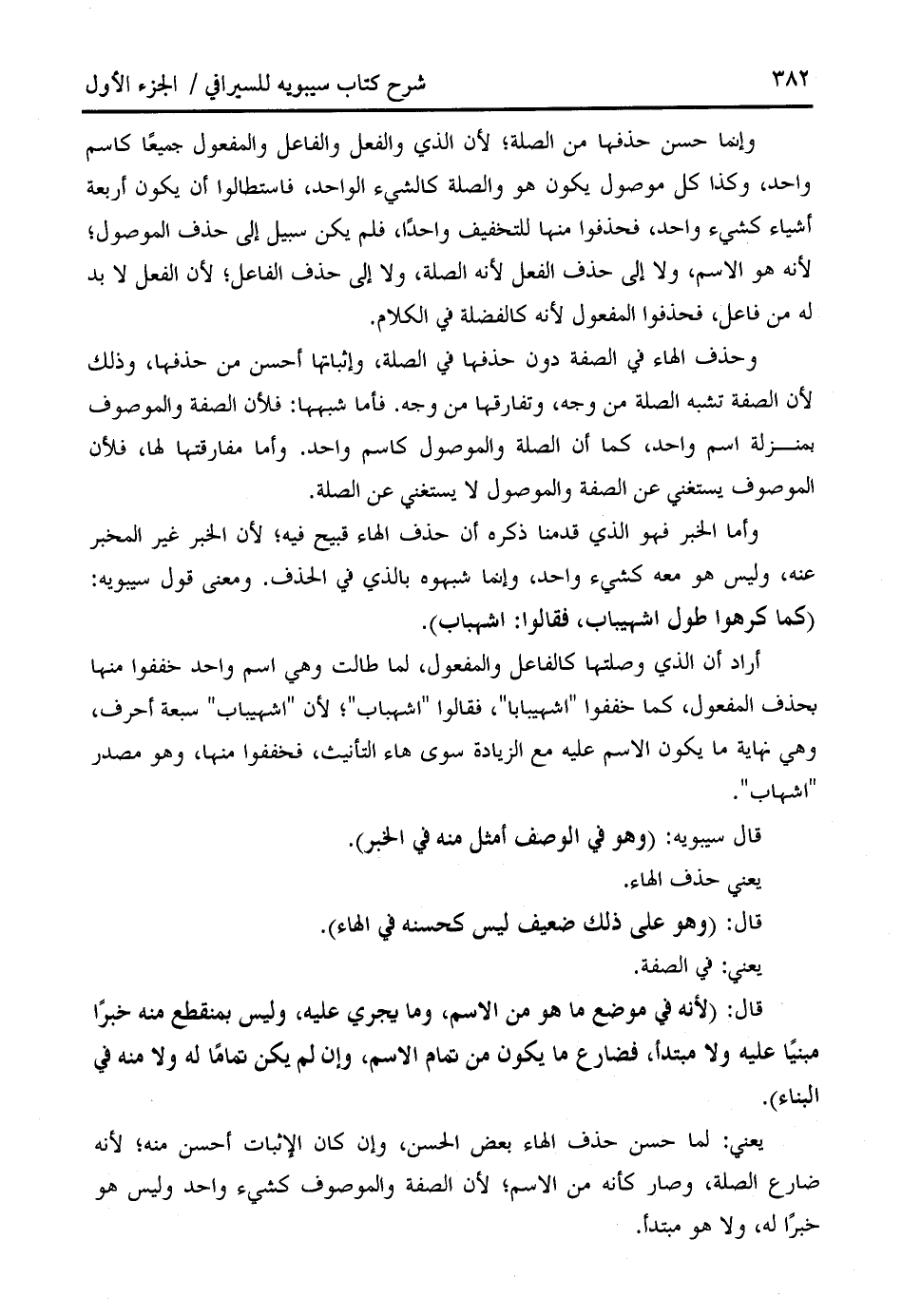 وحذف الهاء في الصفة دون حذفها في الصلة، وإثباتها أحسن من حذفها، وذلك لأن الصفة تشبه الصلة من وجه، وتفارقها من وجه. فأما شبهها: فلأن الصفة والموصوف بمنزلة اسم واحد، كما أن الصلة والموصول كاسم واحد. وأما مفارقتها لها، فلأن الموصوف يستغني عن الصفة والموصول لا يستغني عن الصلة.