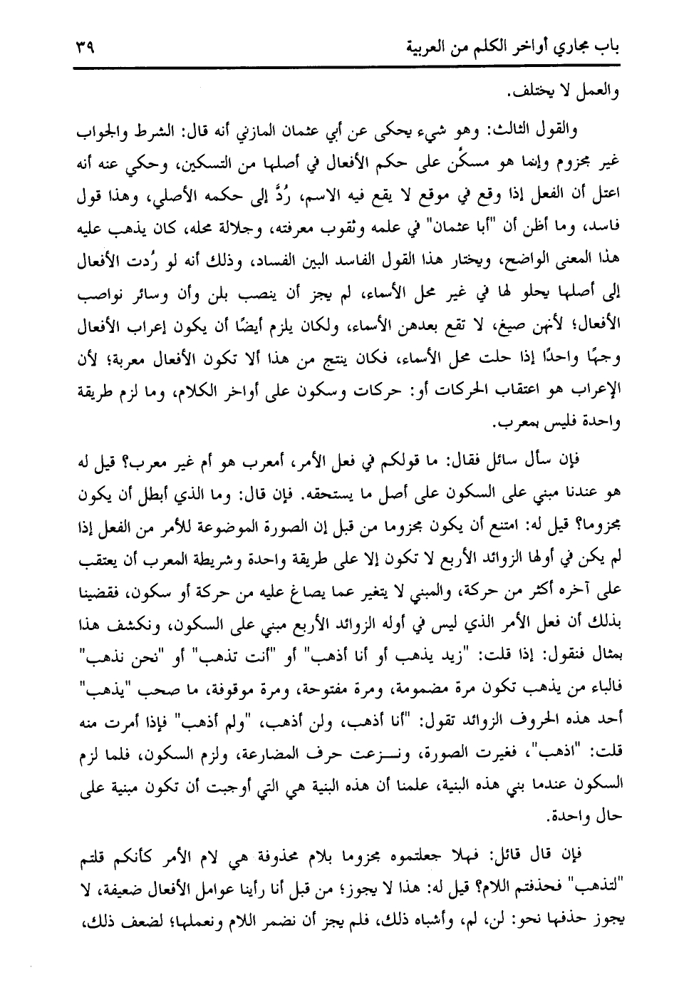 والقول الثالث: وهو شيء يحكى عن أبي عثمان المازني أنه قال: الشرط والجواب غير مجزوم وإنما هو مسكّن على حكم الأفعال في أصلها من التسكين، وحكي عنه أنه اعتل أن الفعل إذا وقع في موقع لا يقع فيه الاسم، ردّ إلى
