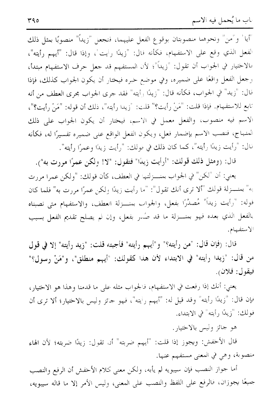 قد جعل حرف الاستفهام مبتدأ، وجعل الفعل واقعا على ضميره، وفي موضع خبره فيختار أن يكون الجواب كذلك، فإذا قال: " زيد " في الجواب، فكأنه قال: " زيدا رأيته " فقد جرى الجواب مجرى العطف من أنه تابع للاستفهام. فإذا قلت: " من رأيت؟ " قلت: " زيدا رأيته "، ذلك أن قوله: " من رأيت؟ "، الاسم فيه منصوب، والفعل معمل في الاسم، فيختار أن يكون الجواب على ذلك المنهاج، فنصب الاسم بإضمار فعل، ويكون الفعل الواقع على ضميره تفسيرا له، فكأنه قال: " رأيت زيدا رأيته "، كما كان ذلك في قولك: " رأيت زيدا وعمرا رأيته ".