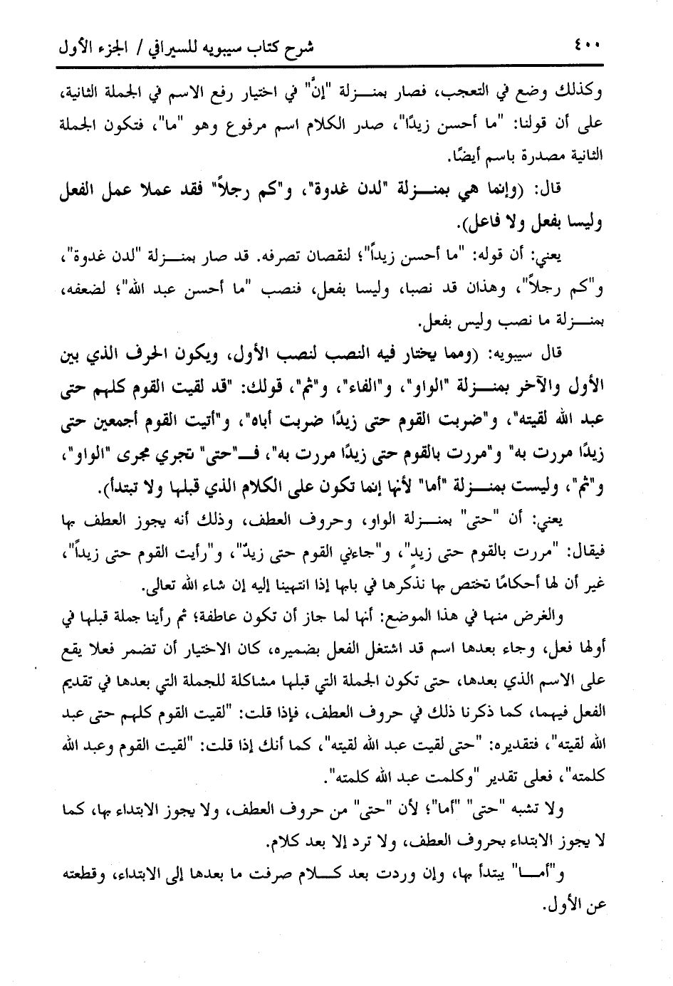 قال سيبويه: (ومما يختار فيه النصب لنصب الأول، ويكون الحرف الذي بين الأول والآخر بمنزلة " الواو "، و " الفاء "، و " ثم "، قولك: " قد لقيت القوم كلهم حتى عبد الله لقيته "، و " ضربت القوم حتى زيدا ضربت أباه "، و " أتيت القوم أجمعين حتى زيدا مررت به " و " مررت بالقوم حتى زيدا مررت به "، ف " حتى " تجري مجرى " الواو "، و " ثم "، وليست بمنزلة " أما " لأنها إنما تكون على الكلام الذي قبلها ولا تبتدأ).
