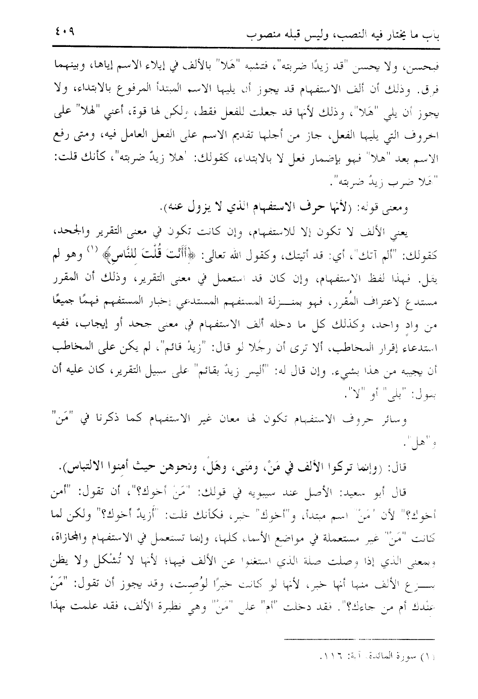 يعني الألف لا تكون إلا للاستفهام، وإن كانت تكون في معنى التقرير والجحد، كقولك: " ألم آتك "، أي: قد أتيتك، وكقول الله تعالى: أَأَنْتَ قُلْتَ لِلنَّاسِ (¬1) وهو لم يقل. فهذا لفظ الاستفهام، وإن كان قد استعمل في معنى التقرير، وذلك أن المقرر مستدع لاعتراف المقرر، فهو بمنزلة المستفهم المستدعي إخبار المستفهم فهما جميعا من واحد واحد، وكذلك كل ما دخله ألف الاستفهام في معنى جحد أو إيجاب، ففيه استدعاء إقرار المخاطب، ألا ترى أن رجلا لو قال: " زيد قائم "، لم يكن على المخاطب أن يجيبه من هذا بشيء. وإن قال له: " أليس زيد بقائم " على سبيل التقرير، كان عليه أن يقول: " بلى " أو " لا ".