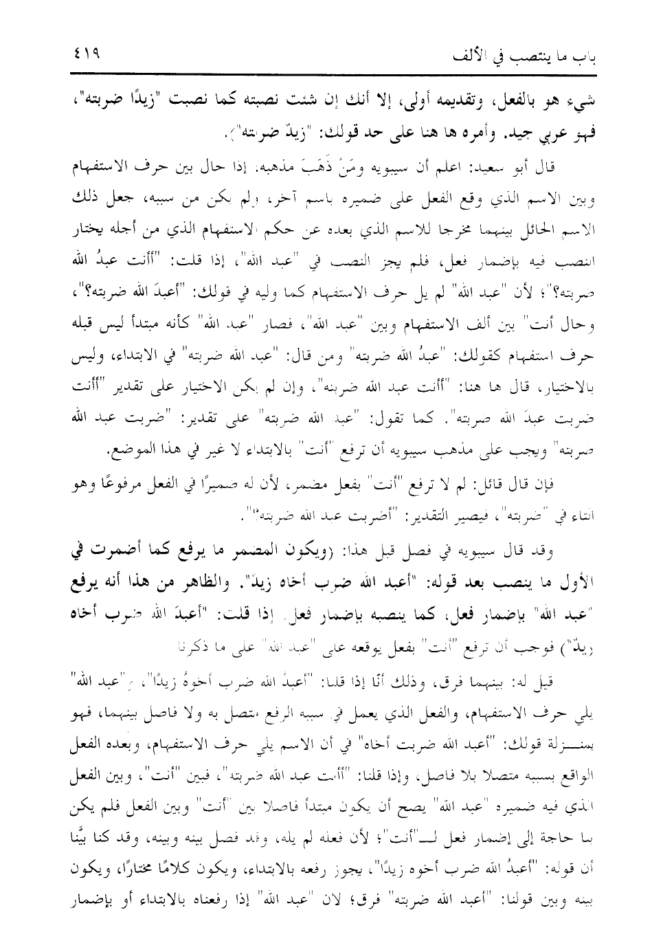قال أبو سعيد: اعلم أن سيبويه ومن ذهب مذهبه، إذا حال بين حرف الاستفهام وبين الاسم الذي وقع الفعل على ضميره باسم آخر، ولم يكن من سببه، جعل ذلك الاسم الحائل بينهما مخرجا للاسم الذي بعده عن حكم الاستفهام الذي من أجله يختار النصب فيه بإضمار فعل، فلم يجز النصب في " عبد الله "، إذا قلت: " أأنت عبد الله ضربته؟ "؛ لأن " عبد الله " لم يل حرف الاستفهام كما وليه في قولك: " أعبد الله ضربته؟ "، وحال أنت " بين ألف الاستفهام وبين " عبد الله "، فصار " عبد الله " كأنه مبتدأ ليس قبله حرف استفهام كقولك: " عبد الله ضربته " ومن قال: " عبد الله ضربته " في الابتداء، وليس بالاختيار، قال ها هنا: " أأنت عبد الله ضربته "، وإن لم يكن الاختيار على تقدير " أأنت ضربت عبد الله ضربته ". كما تقول: " عبد الله ضربته " على تقدير: " ضربت عبد الله ضربته " ويجب على مذهب سيبويه أن ترفع " أنت " بالابتداء لا غير في هذا الموضع.