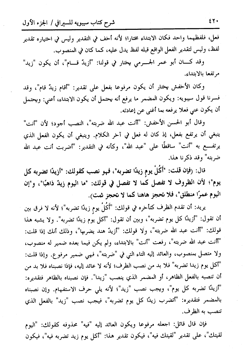 " أكل يوم زيدا تضربه " فلا بد من نصب الظرف؛ لأنه لا عائد إليه، فإذا نصبناه فلا بد من أن تنصبه بالفعل الظاهر، أو المضمر الذي ينصب " زيدا ". فإن نصبناه بالظاهر فتقديره: