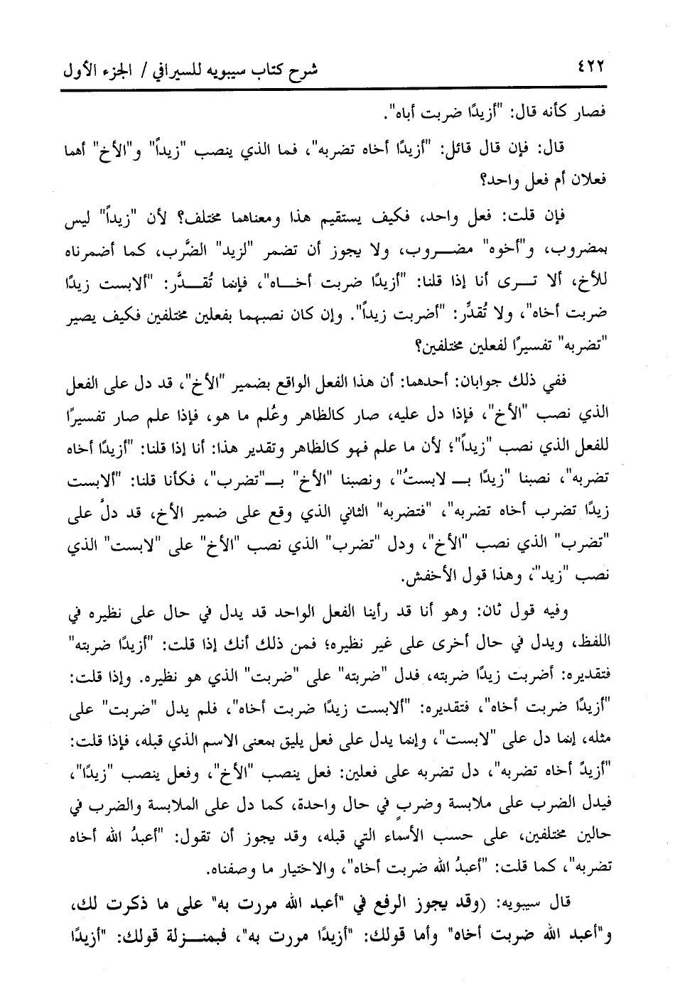 " أزيد أخاه تضربه "، دل تضربه على فعلين: فعل ينصب " الأخ "، وفعل ينصب " زيدا "، فيدل الضرب على ملابسة وضرب في حال واحدة، كما دل على الملابسة والضرب في حالين مختلفين، على حسب الأسماء التي قبله، وقد يجوز أن تقول: " أعبد الله أخاه تضربه "، كما قلت: " أعبد الله ضربت أخاه "، والاختيار ما وصفناه.