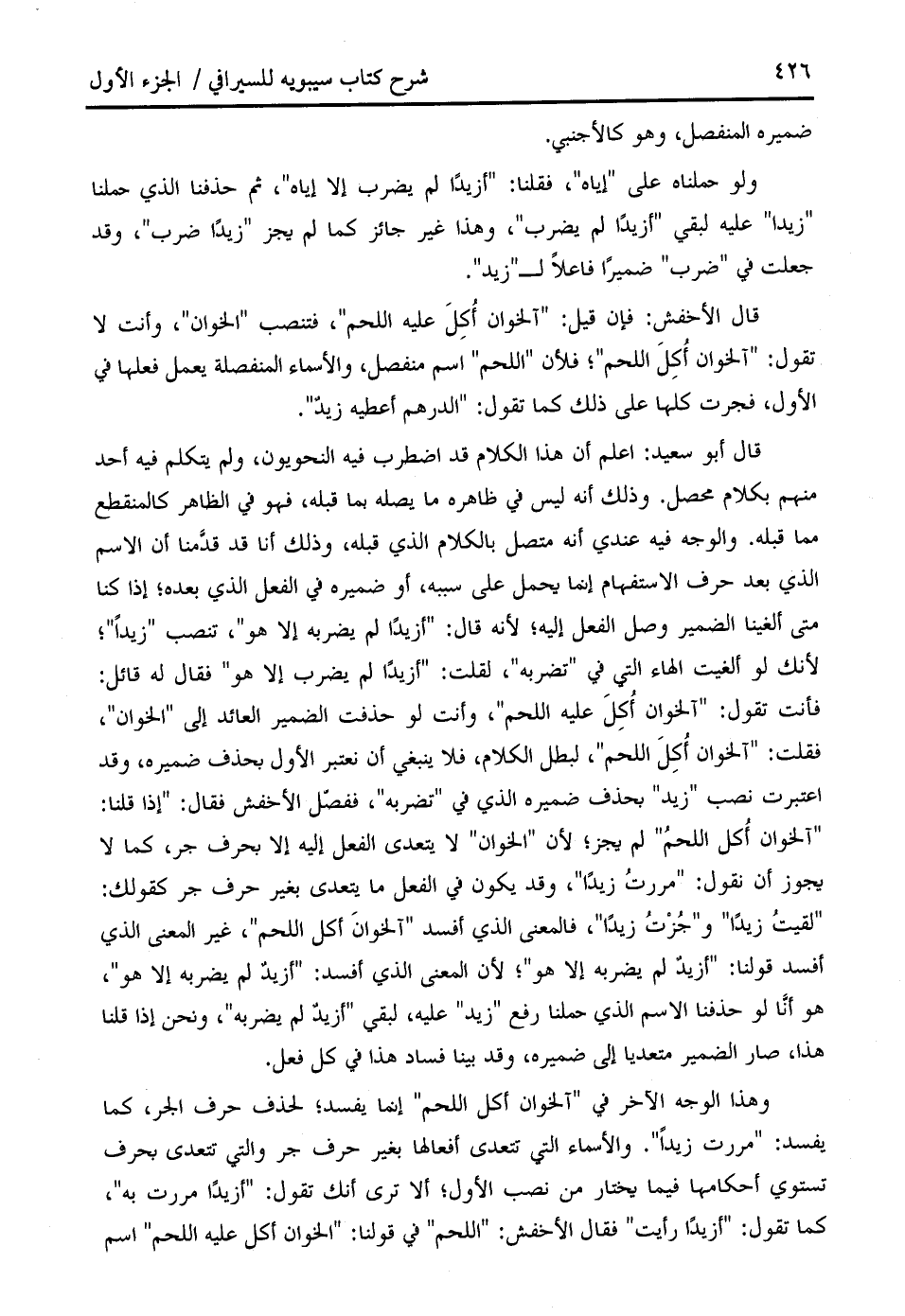 فأنت تقول: " آلخوان أكل عليه اللحم "، وأنت لو حذفت الضمير العائد إلى " الخوان "، فقلت: " آلخوان أكل اللحم "، لبطل الكلام، فلا ينبغي أن نعتبر الأول بحذف ضميره، وقد اعتبرت نصب " زيد " بحذف ضميره الذي في " تضربه "، ففصّل الأخفش فقال: " إذا قلنا: