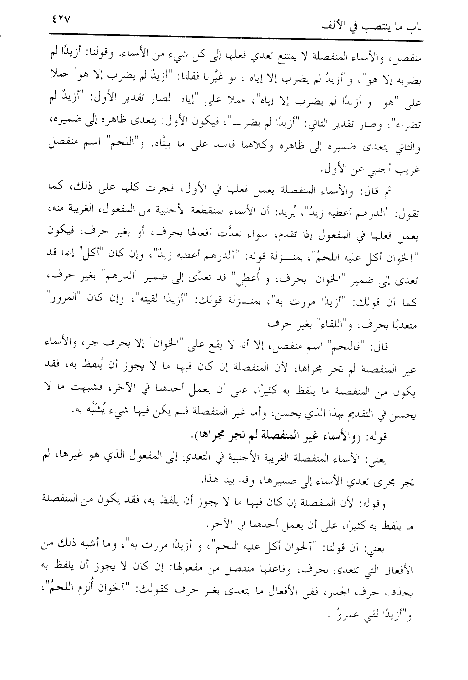 منفصل، والأسماء المنفصلة لا يمتنع تعدي فعلها إلى كل شيء من الأسماء. وقولنا: أزيدا لم يضربه إلا هو "، و " أزيد لم يضرب إلا إياه "، لو غيّرنا فقلنا: " أزيد لم يضرب إلا هو " حملا على " هو " و " أزيدا لم يضرب إلا إياه "، حملا على " إياه " لصار تقدير الأول: " أزيد لم تضربه "، وصار تقدير الثاني: " أزيدا لم يضرب "، فيكون الأول: يتعدى ظاهره إلى ضميره، والثاني يتعدى ضميره إلى ظاهره وكلاهما فاسد على ما بيّناه. و " اللحم " اسم منفصل غريب أجنبي عن الأول.