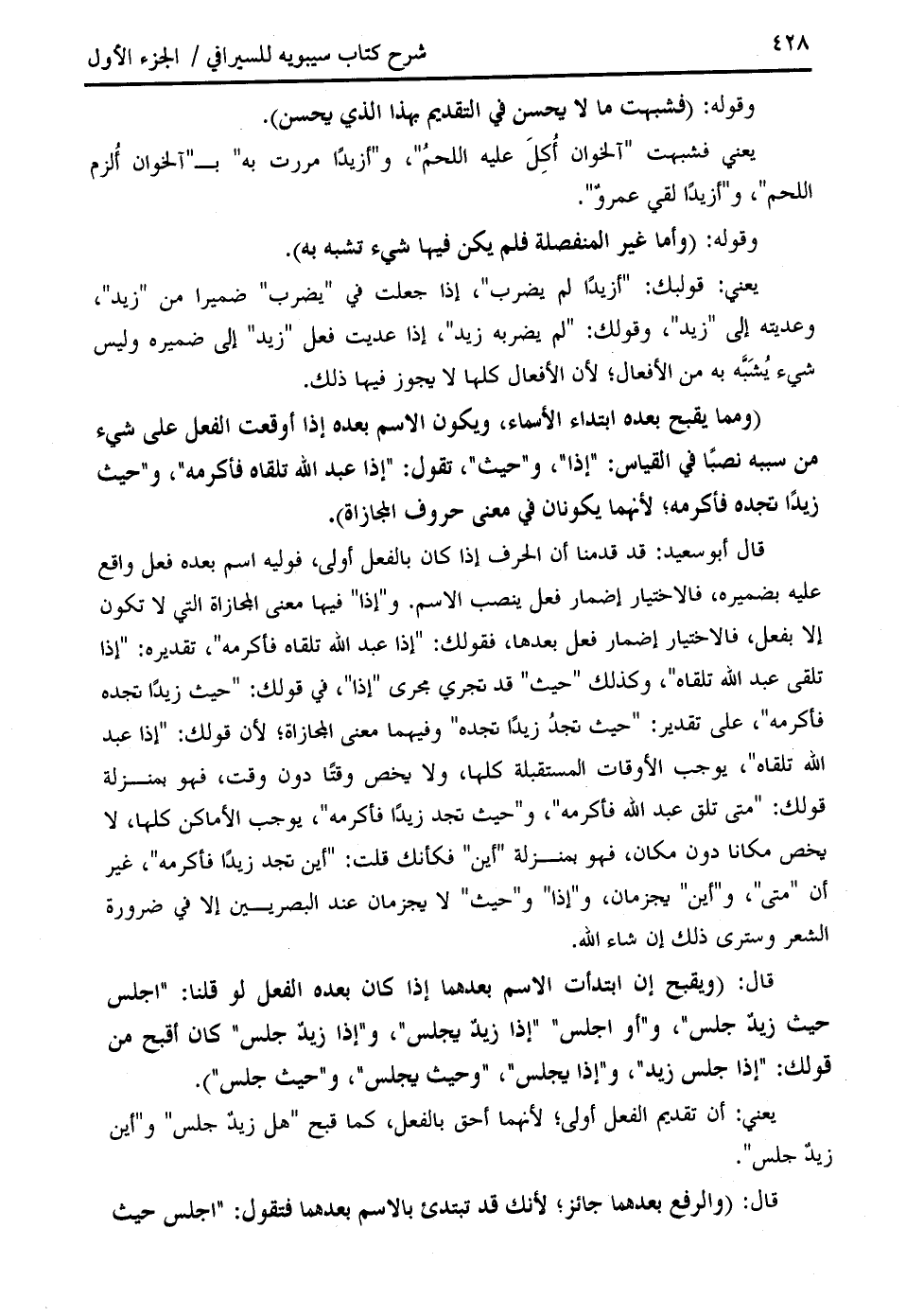 قال أبو سعيد: قد قدمنا أن الحرف إذا كان بالفعل أولى، فوليه اسم بعده فعل واقع عليه بضميره، فالاختيار إضمار فعل ينصب الاسم. و " إذا " فيها معنى المجازاة التي لا تكون إلا بفعل، فالاختيار إضمار فعل بعدها، فقولك: " إذا عبد الله تلقاه فأكرمه "، تقديره: " إذا تلقى عبد الله تلقاه "، وكذلك " حيث " قد تجري مجرى " إذا "، في قولك: " حيث زيدا تجده فأكرمه "، على تقدير: " حيث تجد زيدا تجده " وفيهما معنى المجازاة؛ لأن قولك: " إذا عبد الله تلقاه "، يوجب الأوقات المستقبلة كلها، ولا يخص وقتا دون وقت، فهو بمنزلة قولك: " متى تلق عبد الله فأكرمه "، و " حيث تجد زيدا فأكرمه "، يوجب الأماكن كلها، لا يخص مكانا دون مكان، فهو بمنزلة " أين " فكأنك قلت: " أين تجد زيدا فأكرمه "، غير أن " متى "، و " أين " يجزمان، و " إذا " و " حيث " لا يجزمان عند البصريين إلا في ضرورة الشعر وسترى ذلك إن شاء الله.