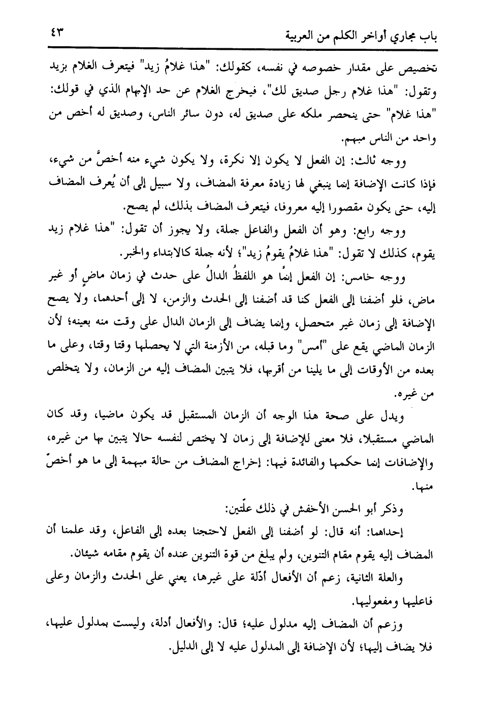 ووجه خامس: إن الفعل إنّما هو اللفظ الدال على حدث في زمان ماض أو غير ماض، فلو أضفنا إلى الفعل كنا قد أضفنا إلى الحدث والزمن، لا إلى أحدهما، ولا يصح الإضافة إلى زمان غير متحصل، وإنما يضاف إلى الزمان