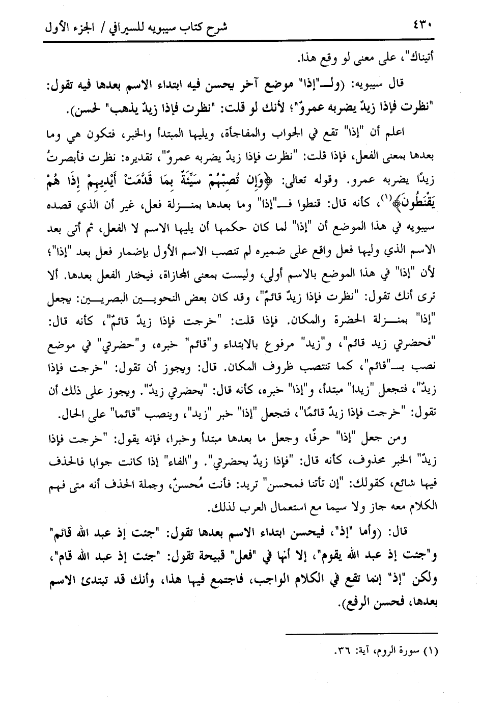 اعلم أن " إذا " تقع في الجواب والمفاجأة، ويليها المبتدأ والخبر، فتكون هي وما بعدها بمعنى الفعل، فإذا قلت: " نظرت فإذا زيد يضربه عمرو "، تقديره: نظرت فأبصرت زيدا يضربه عمرو. وقوله تعالى: وَإِنْ تُصِبْهُمْ سَيِّئَةٌ بِما قَدَّمَتْ أَيْدِيهِمْ إِذا هُمْ يَقْنَطُونَ (¬1)، كأنه قال: قنطوا ف " إذا " وما بعدها بمنزلة فعل، غير أن الذي قصده سيبويه في هذا الموضع أن " إذا " لما كان حكمها أن يليها الاسم لا الفعل، ثم أتى بعد الاسم الذي وليها فعل واقع على ضميره لم تنصب الاسم الأول بإضمار فعل بعد " إذا "؛ لأن " إذا " في هذا الموضع بالاسم أولى، وليست بمعنى المجازاة، فيختار الفعل بعدها. ألا ترى أنك تقول: " نظرت فإذا زيد قائم "، وقد كان بعض النحويين البصريين: يجعل " إذا " بمنزلة الحضرة والمكان. فإذا قلت: " خرجت فإذا زيد قائم "، كأنه قال: