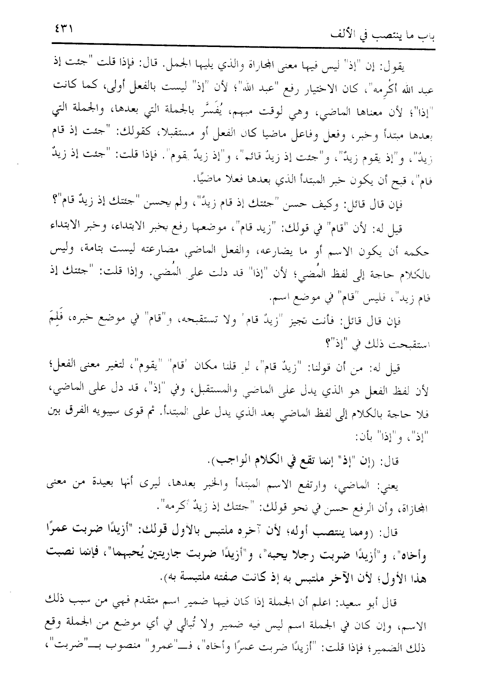 يقول: إن " إذ " ليس فيها معنى المجازاة والذي يليها الجمل. قال: فإذا قلت " جئت إذ عبد الله أكرمه "، كان الاختيار رفع " عبد الله "؛ لأن " إذ " ليست بالفعل أولى، كما كانت " إذا "؛ لأن معناها الماضي، وهي لوقت مبهم، يفسّر بالجملة التي بعدها، والجملة التي بعدها مبتدأ وخبر، وفعل وفاعل ماضيا كان الفعل أو مستقبلا، كقولك: " جئت إذ قام