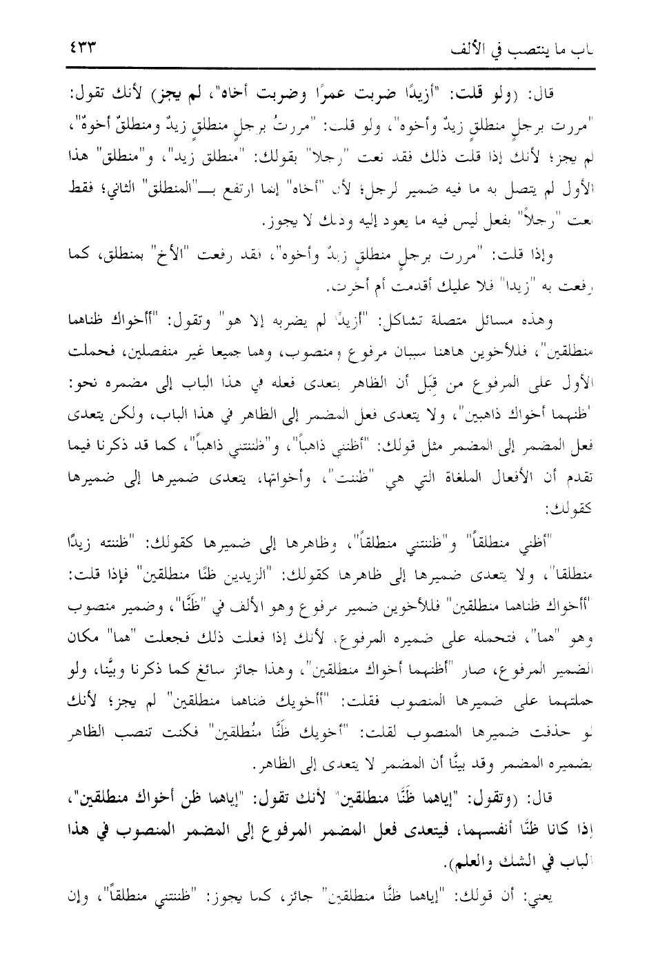 وهذه مسائل متصلة تشاكل: " أزيدا لم يضربه إلا هو " وتقول: " أأخواك ظناهما منطلقين "، فللأخوين هاهنا سببان مرفوع ومنصوب، وهما جميعا غير منفصلين، فحملت الأول على المرفوع من قبل أن الظاهر يتعدى فعله في هذا الباب إلى مضمره نحو: