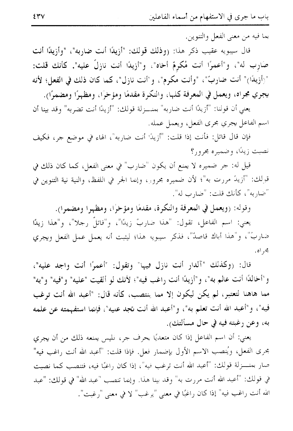 " (أزيدا) " أنت ضارب "، " وأنت مكرم "، و " أنت نازل "، كما كان ذلك في الفعل؛ لأنه يجري مجراه، ويعمل في المعرفة كلها، والنكرة مقدما ومؤخرا، ومظهرا ومضمرا).