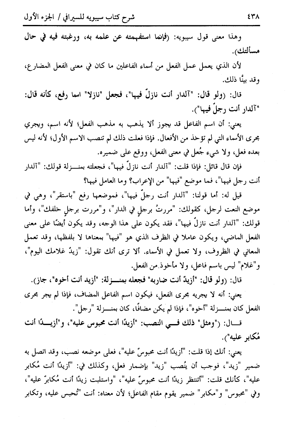 قيل له: أما قولنا: " آلدار أنت رجل فيها "، فموضعها رفع " باستقر "، وهي في موضع النعت لرجل، كقولك: " مررت برجل في الدار "، و " مررت برجل خلفك "، وأما قولك: " آلدار أنت نازل فيها "، فقد يكون على هذا الوجه، وقد يكون أيضا على معنى الفعل الماضي، ويكون عاملا في الظرف الذي هو " فيها " بمعناها لا بلفظها، وقد تعمل المعاني في الظروف، ولا تعمل في الأسماء. ألا ترى أنك تقول: " زيد غلامك اليوم "، و " غلام " ليس باسم فاعل، ولا مأخوذ من الفعل.