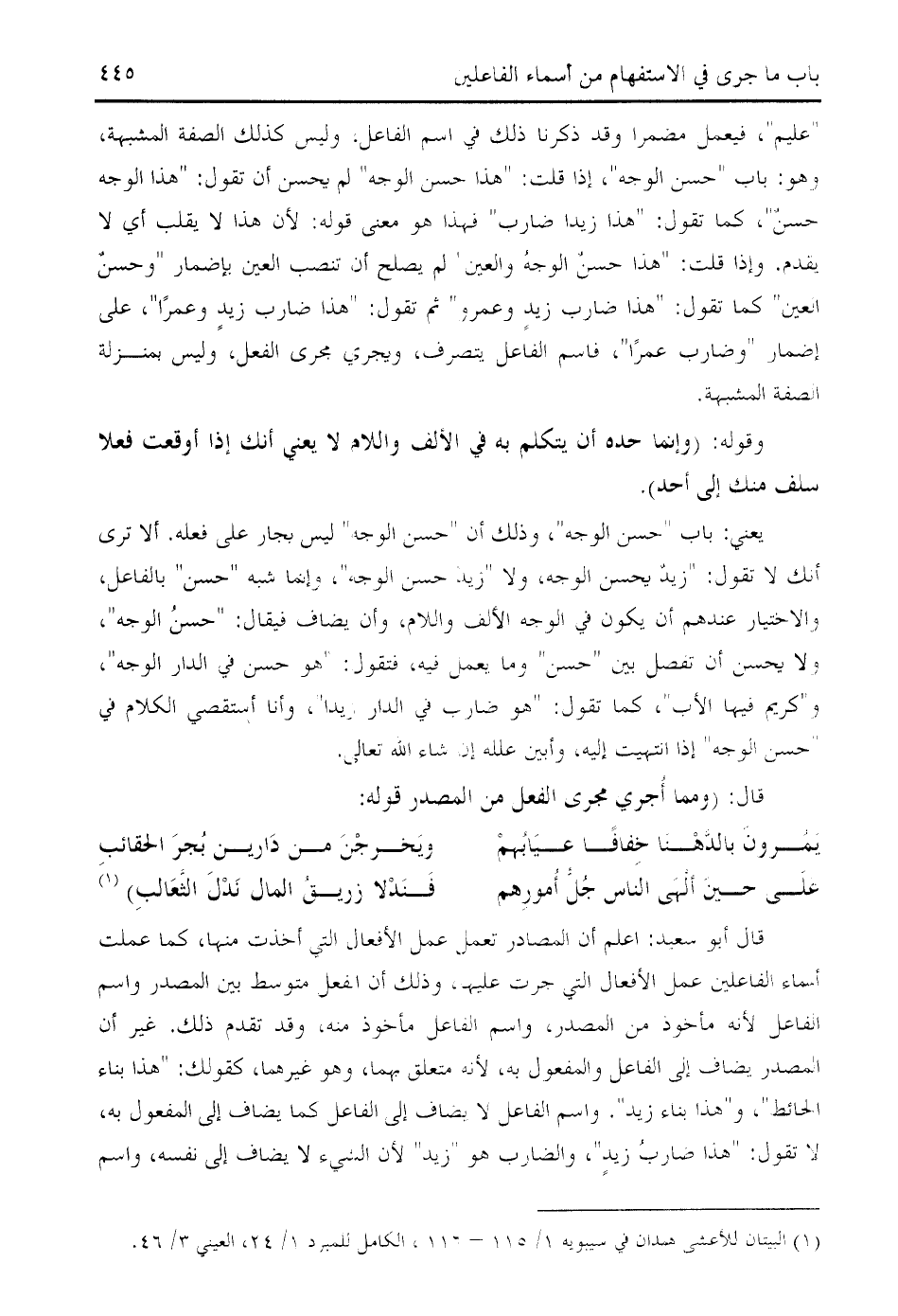 " عليم "، فيعمل مضمرا وقد ذكرنا ذلك في اسم الفاعل، وليس كذلك الصفة المشبهة، وهو: باب " حسن الوجه "،