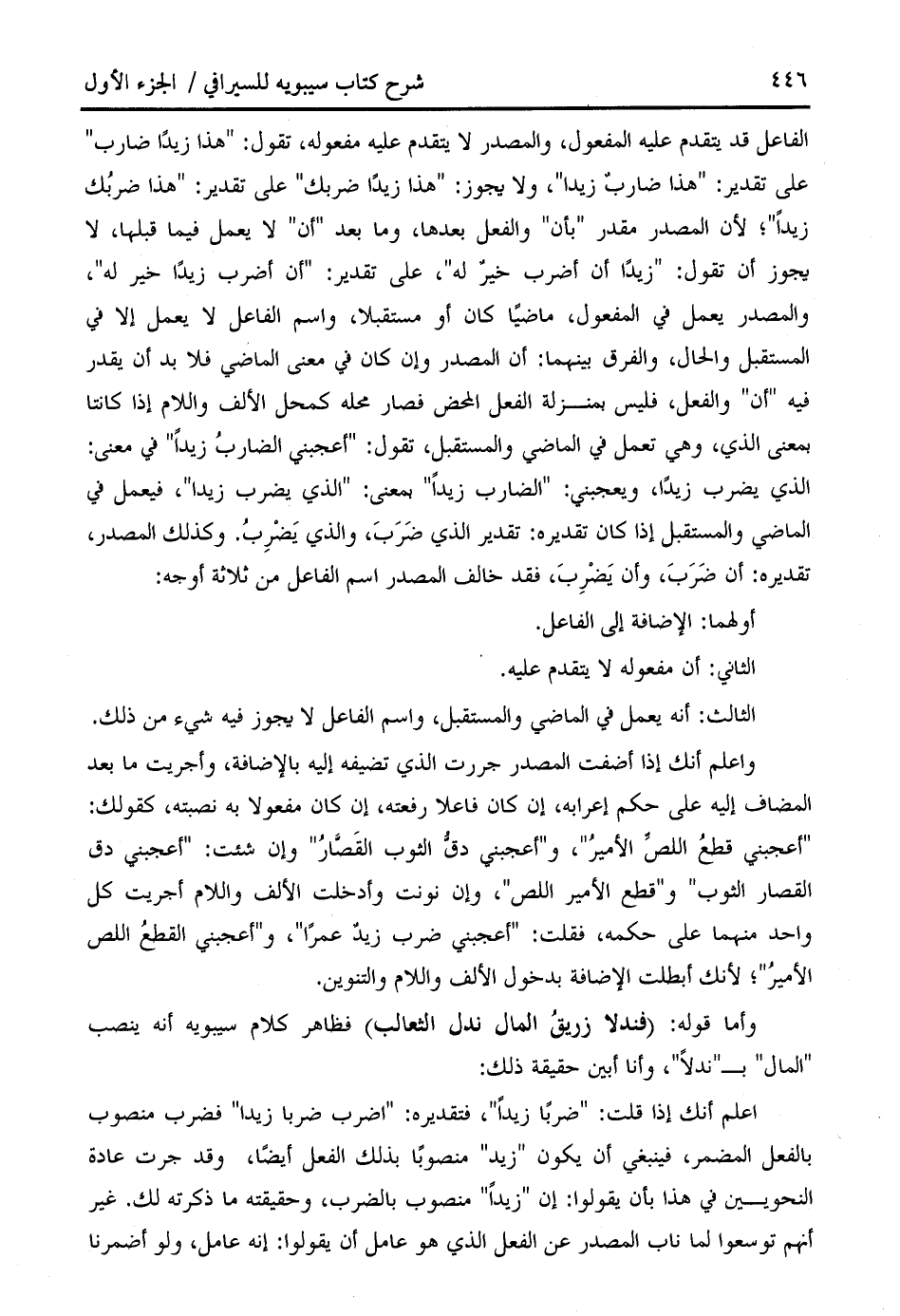الذي يضرب زيدا، ويعجبني: " الضارب زيدا " بمعنى: " الذي يضرب زيدا "، فيعمل في الماضي والمستقبل إذا كان تقديره: تقدير الذي ضرب، والذي يضرب. وكذلك المصدر، تقديره: أن ضرب، وأن يضرب، فقد خالف المصدر اسم الفاعل من ثلاثة أوجه:
