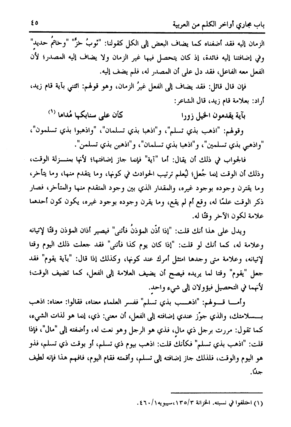 وأما قولهم: " اذهب بذي تسلم " ففسر العلماء معناه، فقالوا: معناه: اذهب بسلامتك، والذي جوّز عندي إضافته إلى الفعل، أن معنى: ذي، إنما هو لذات الشيء، كما تقول: مررت برجل ذي مال، فذي هو الرجل وهو نعت له، وأضفته إلى " مال "، فإذا قلت: " اذهب بذي تسلم " فكأنك قلت: اذهب بيوم ذي تسلم، أو بوقت ذي تسلم، فذو هو اليوم والوقت، فلذلك جاز إضافته إلى تسلم، وأقمته فقام اليوم، فافهم هذا فإنه لطيف جدا.