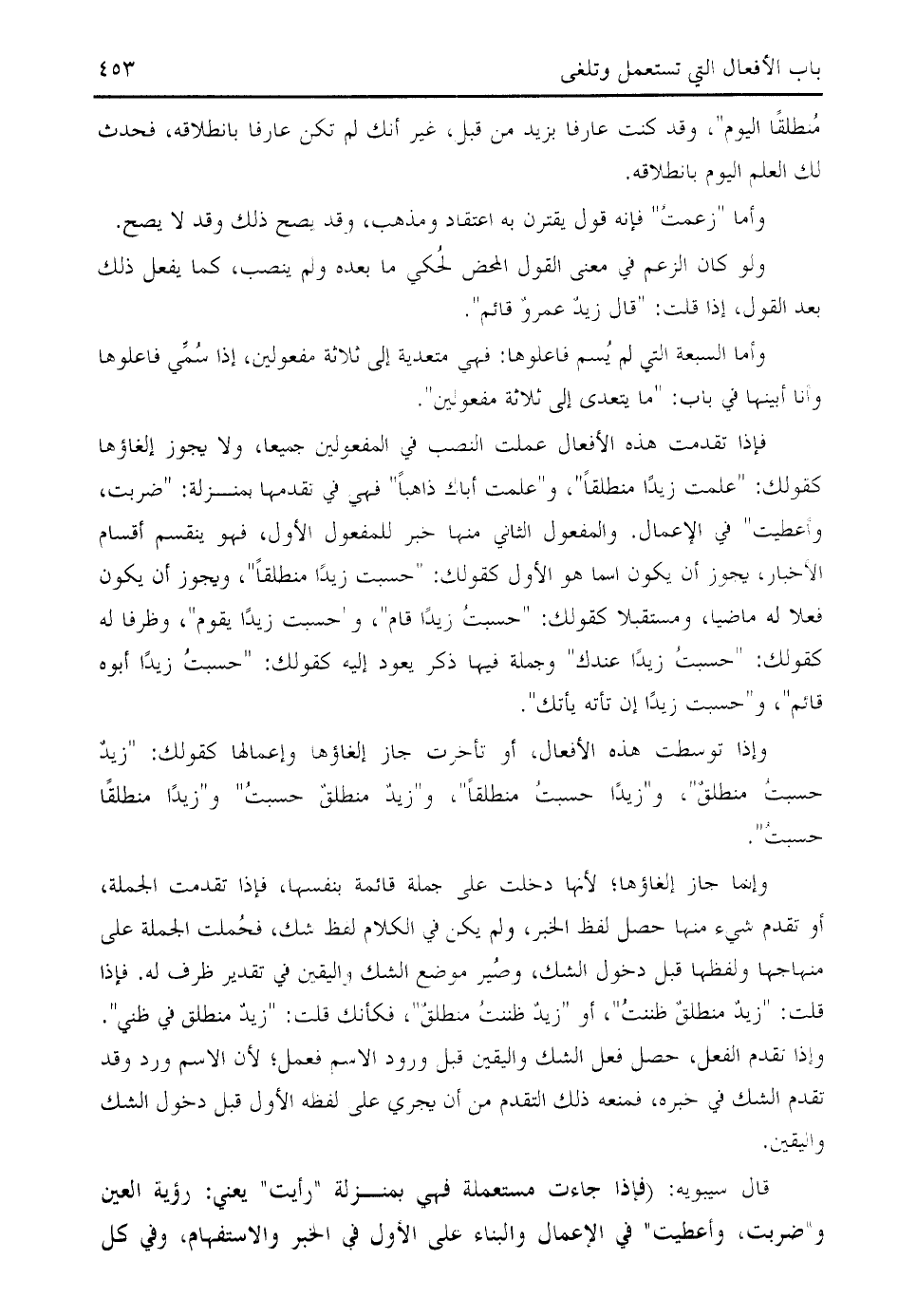 وإذا توسطت هذه الأفعال، أو تأخرت جاز إلغاؤها وإعمالها كقولك: " زيد حسبت منطلق "، و " زيدا حسبت منطلقا "، و " زيد منطلق حسبت " و " زيدا منطلقا حسبت ".