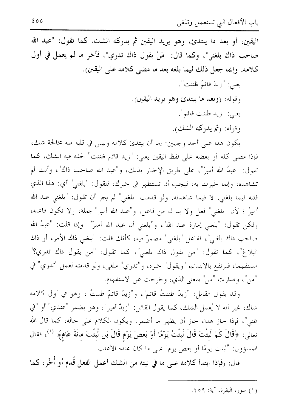 وقد يقول القائل: " زيد ظننت قائم "، و " زيد قائم ظننت "، وهو في أول كلامه شاك، غير أنه لا يعمل الشك، كما يقول القائل: " زيد أمير "، وهو يضمر " عندي " أو " في ظني "، فإذا جاز هذا، جاز أن يظهر ما أضمر، ويكون الكلام على حاله، كما قال الله تعالى: قالَ كَمْ لَبِثْتَ قالَ لَبِثْتُ يَوْماً أَوْ بَعْضَ يَوْمٍ قالَ بَلْ لَبِثْتَ مِائَةَ عامٍ (¬1)، فقال المسؤول: " لبثت يوما أو بعض يوم " على ما كان عنده الأغلب.