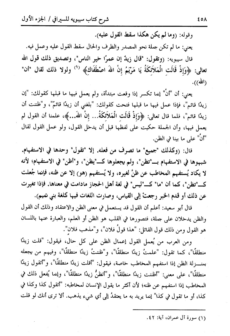 ومن العرب من يعمل القول إعمال الظن على كل حال، فيقول: " قلت زيدا منطلقا "، كما تقول: " علمت زيدا منطلقا "، و " ظننت زيدا منطلقا "، وفيهم من يجعله بمنزلة الظن إذا استفهم المخاطب خاصة، فيقول: " أقلت زيدا منطلقا "، و " أتقول زيدا منطلقا "، على معنى: " أظننت زيدا منطلقا "، و " أتظنّ زيدا منطلقا "، وإنما يفعل ذلك في المخاطب إذا استفهم عن ظنه؛ لأن أكثر ما يقول الإنسان لمخاطبه: " أتقول كذا وكذا في كذا، أو ما تقول في كذا " إنما يريد به ما يعتقد إلى أي شيء يذهب. ألا ترى أنك لو قلت