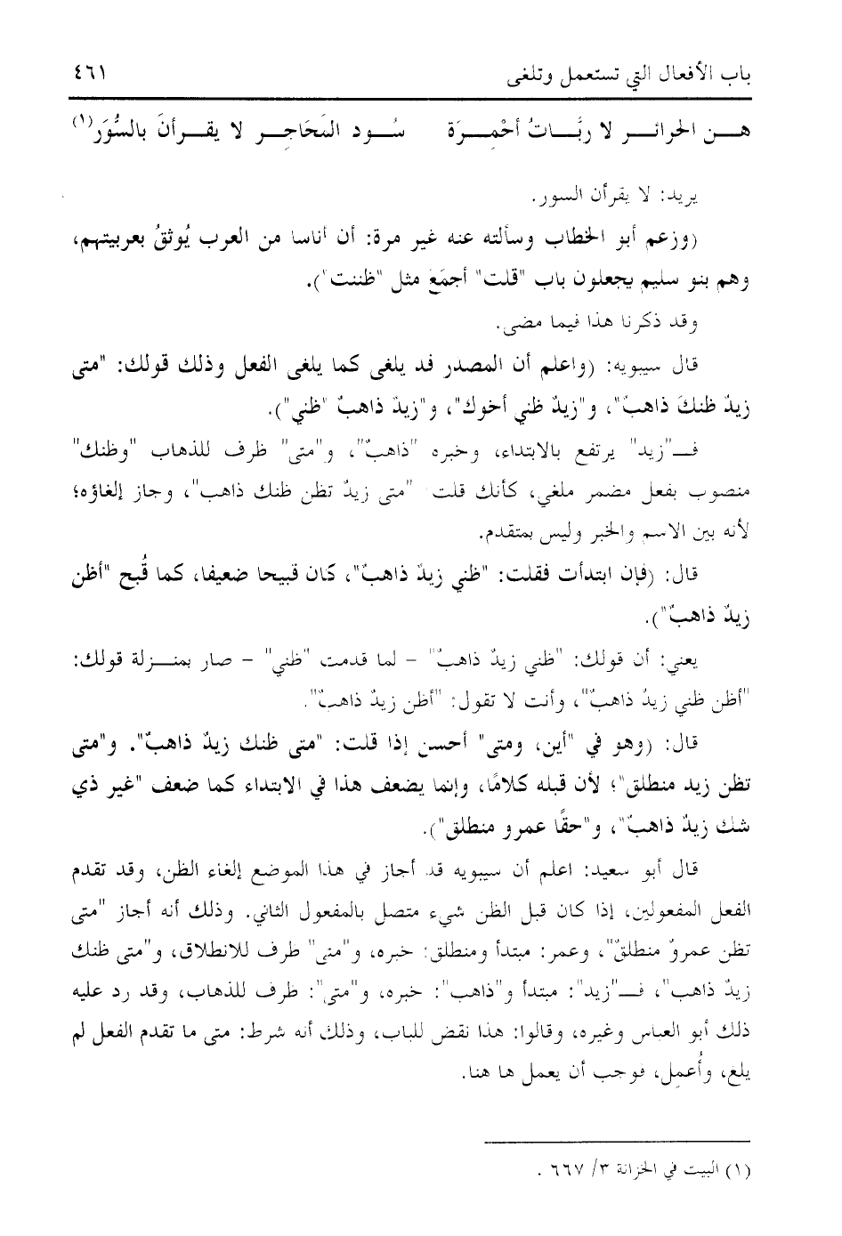 قال أبو سعيد: اعلم أن سيبويه قد أجاز في هذا الموضع إلغاء الظن، وقد تقدم الفعل المفعولين، إذا كان قبل الظن شيء متصل بالمفعول الثاني. وذلك أنه أجاز " متى تظن عمرو منطلق "، وعمر: مبتدأ ومنطلق: خبره، و " متى " ظرف للانطلاق، و " متى ظنك زيد ذاهب "، ف " زيد ": مبتدأ و " ذاهب ": خبره، و " متى ": ظرف للذهاب، وقد رد عليه ذلك أبو العباس وغيره، وقالوا: هذا نقض للباب، وذلك أنه شرط: متى ما تقدم الفعل لم يلغ، وأعمل، فوجب أن يعمل ها هنا.
